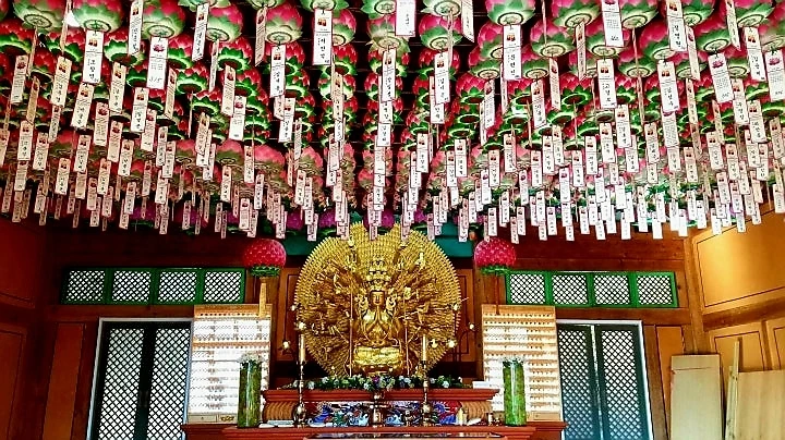 관음상을 모신 대웅전 천정 가득 연등 고요히 달려있고 그 아래 가부좌 자세로 참선에 든 젊은 여인 실루엣이 진중하다.