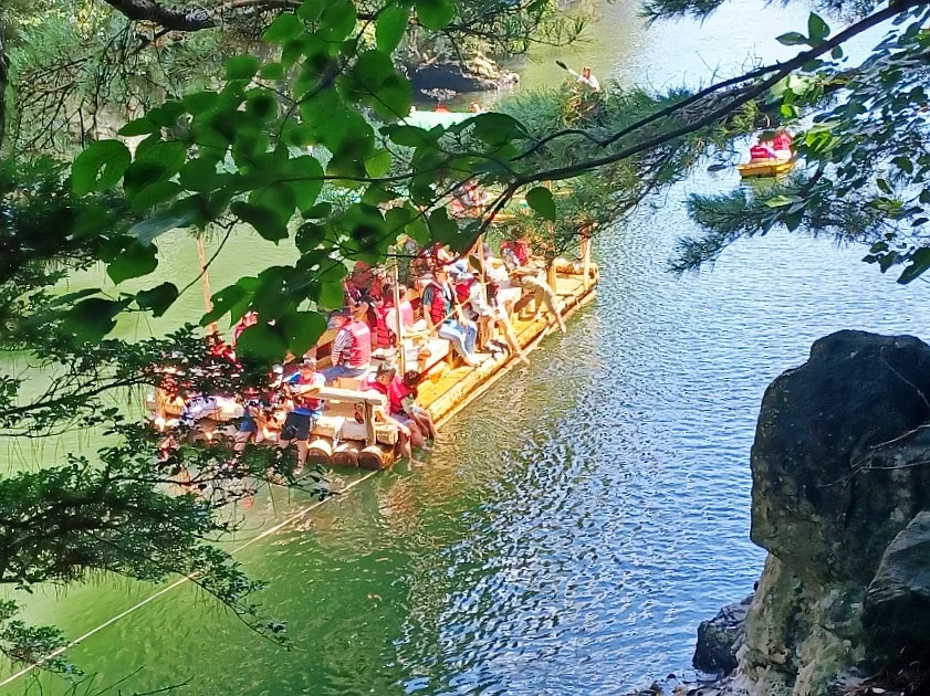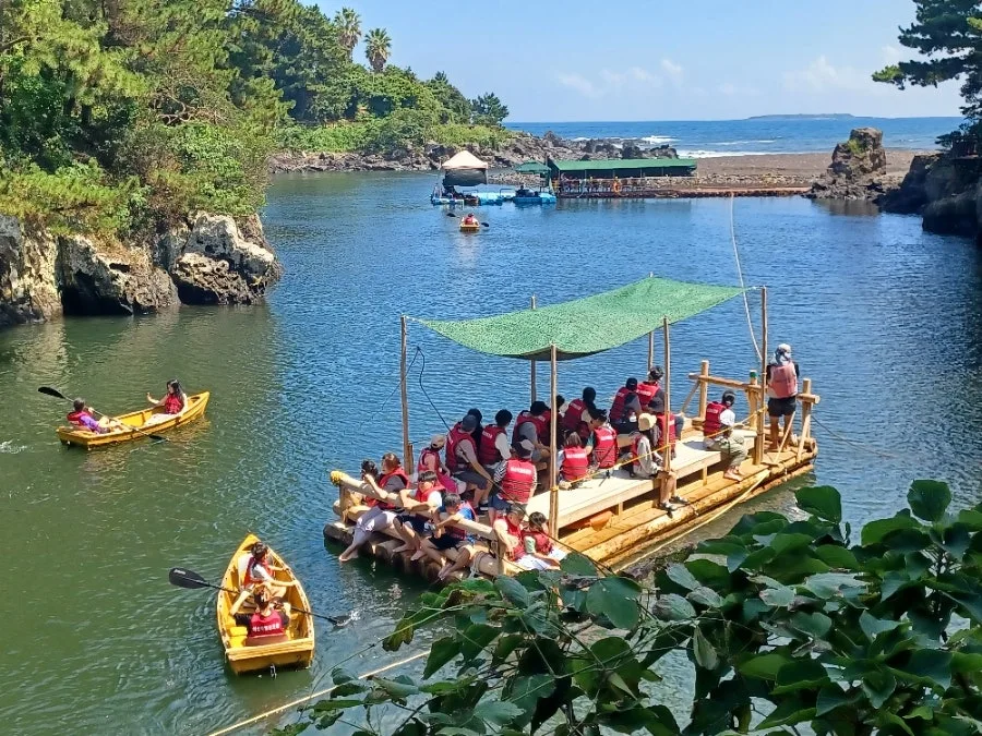 줄 배 형식의 테우와 보트를 타는 물놀이객 구명조끼가 꽃잎같이 붉다.
