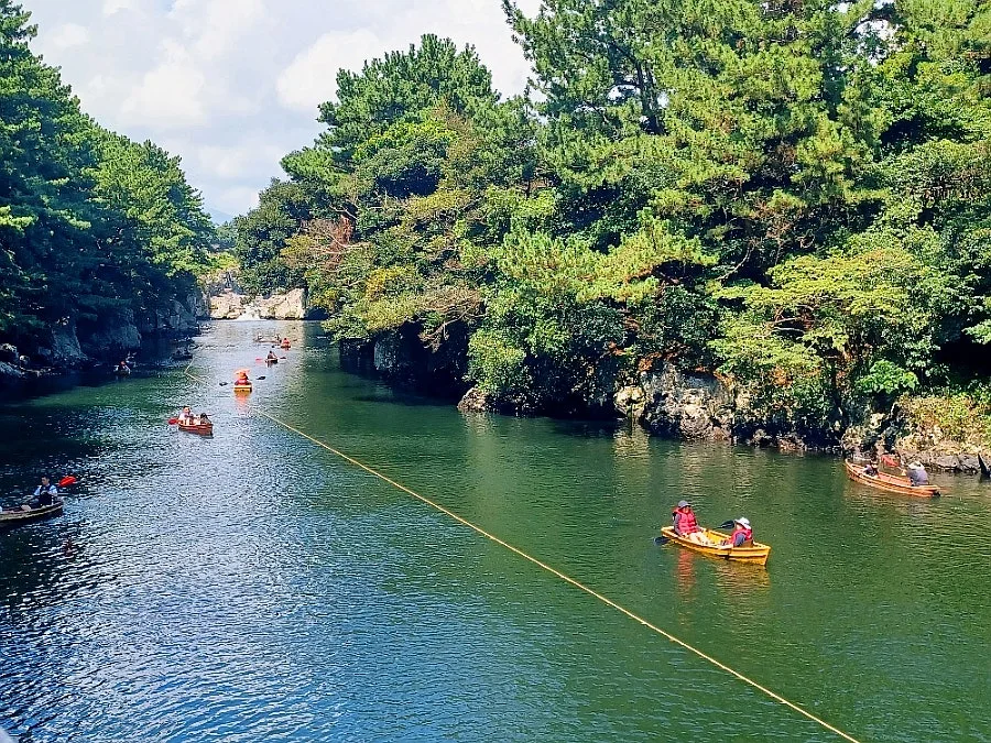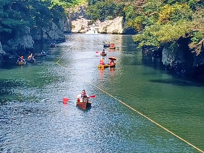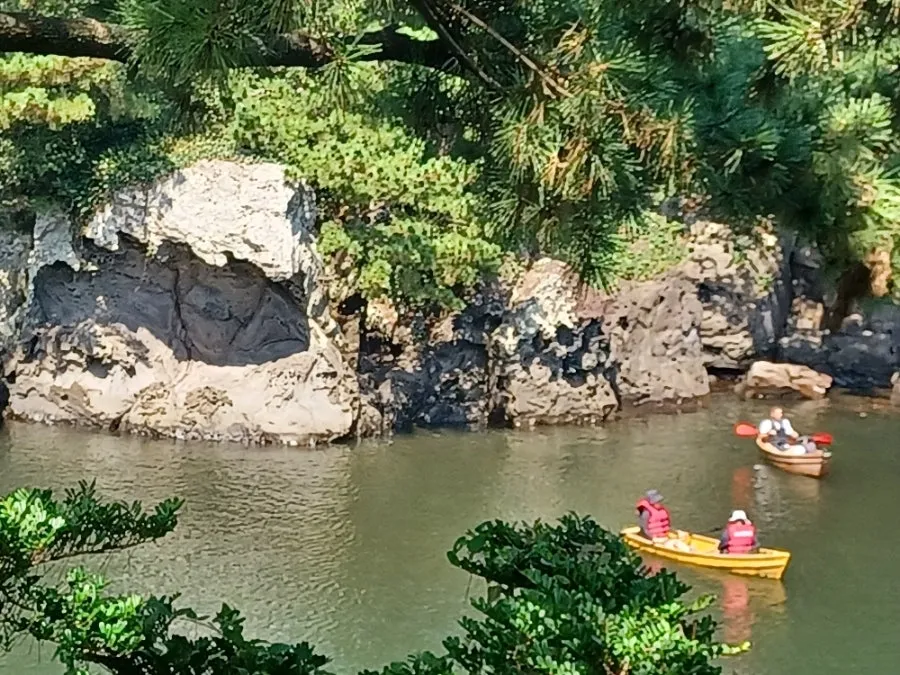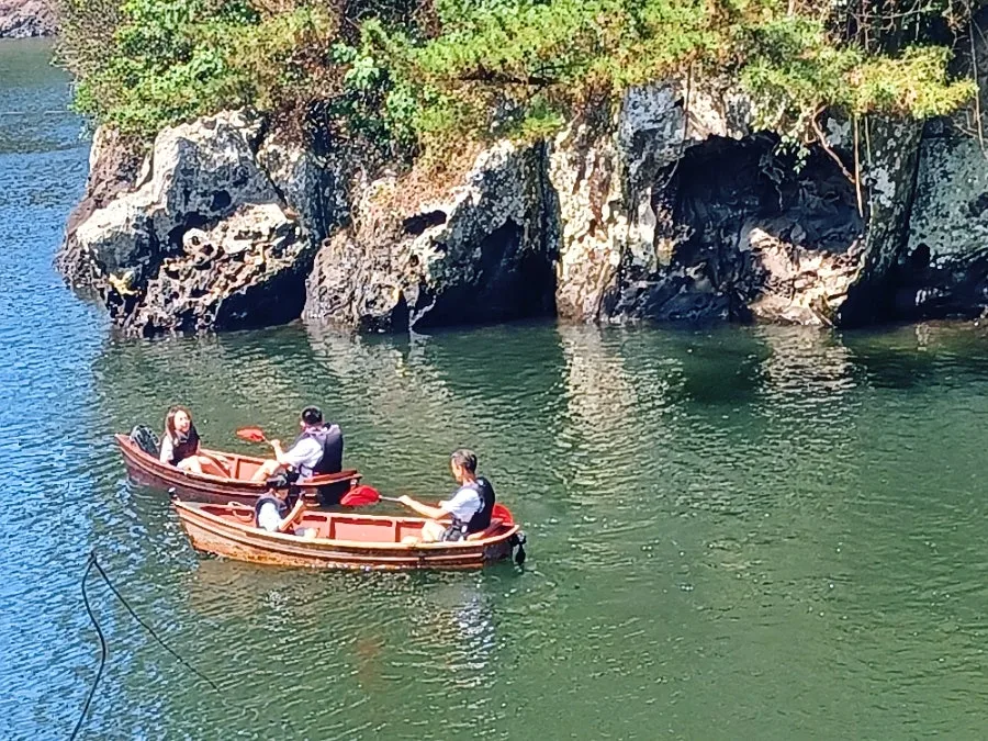 저 아래 여유만만 뱃놀이 즐기는 여행객들, 모쪼록 일상의 회포 여기에 다 풀어놓고 떠나소서.
