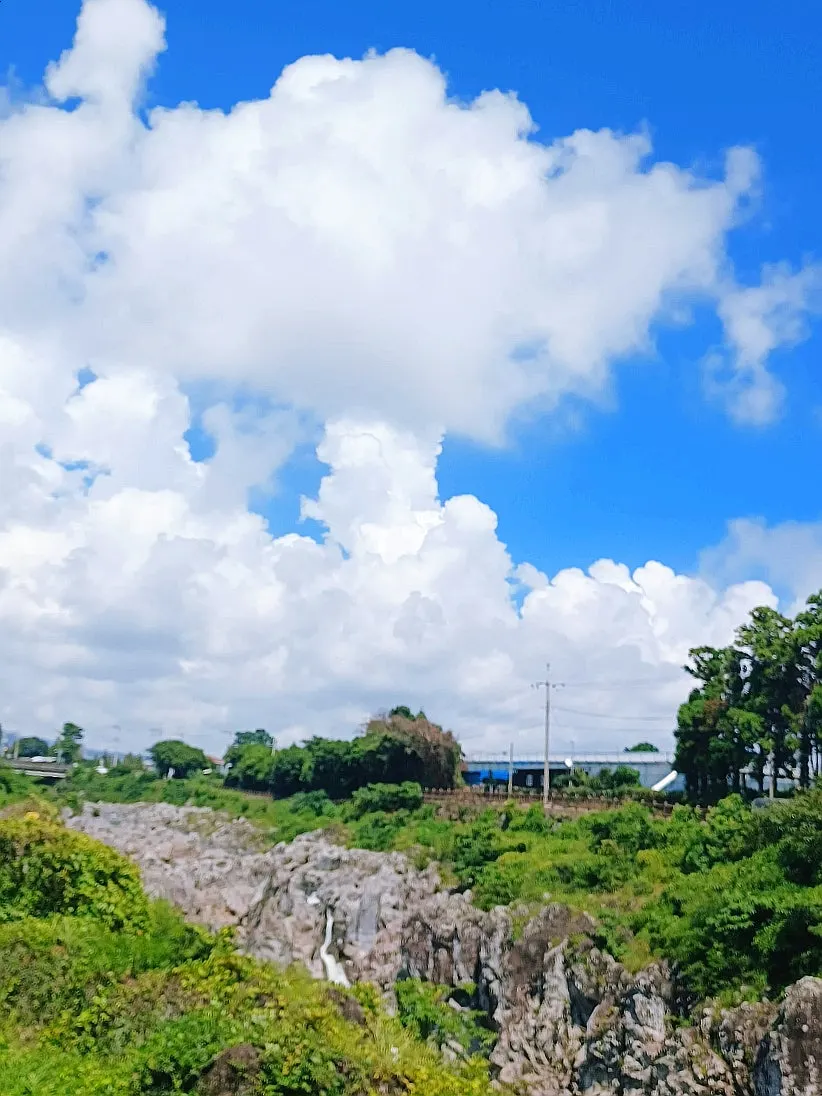 쇠소깍 들머리 교각에서 북쪽을 바라보니 한라산 백록담은 흰 구름 거느렸고 맹살공원 저 아래는 물길 푸르다.