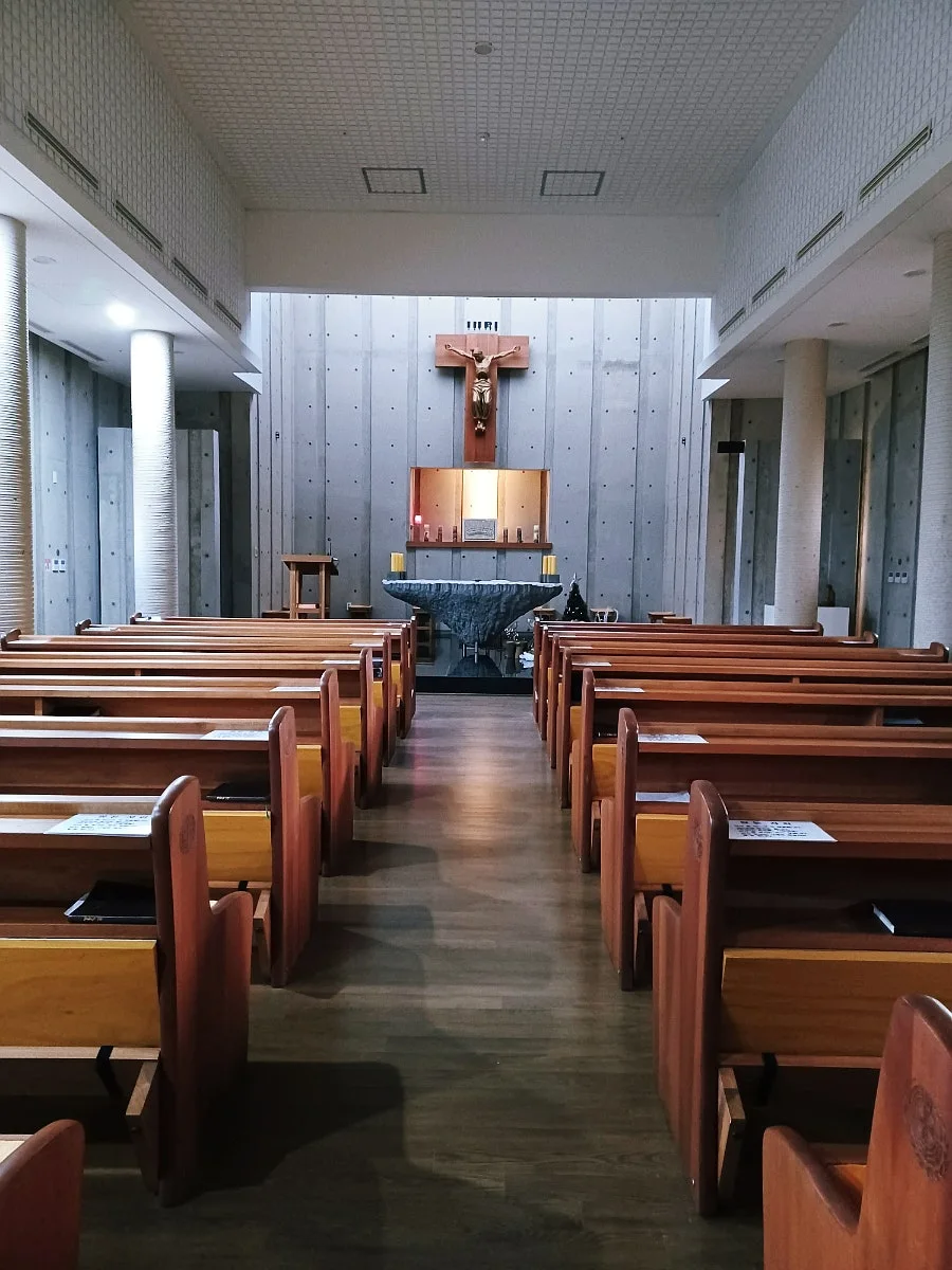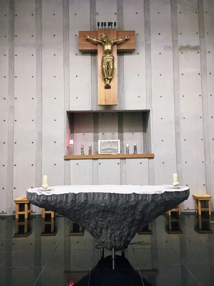 주님의 집 안내 표식 따라 성당에 들어서면 한라산을 모티브로 한 제대와 상투를 튼 한복 차림의 십자고상 독특하다.