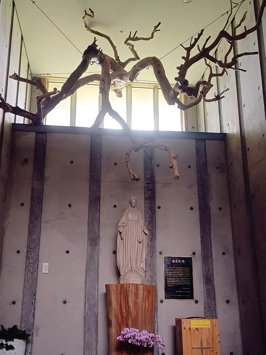 고사목은 방부처리 후 비정형 나무조각 작품으로 재탄생해 <홍로의 맥>이라는 제목으로 성당 로비에 걸려 있다.