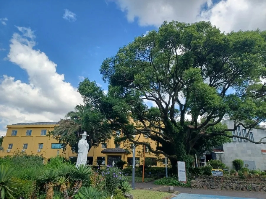 녹나무에 가려진 겨자색 본관과 연회색 수도원 성당이 옆으로 드러난다.