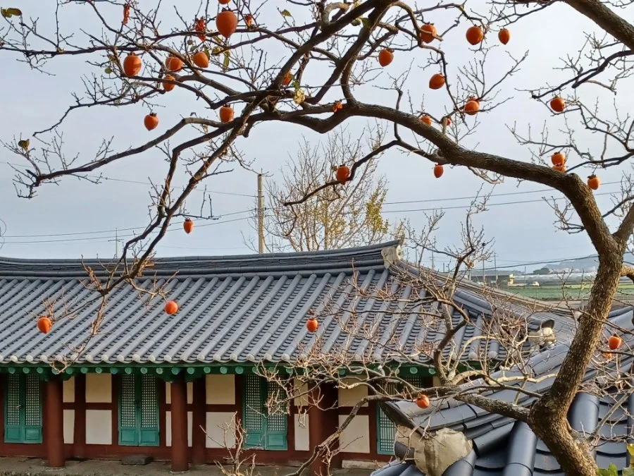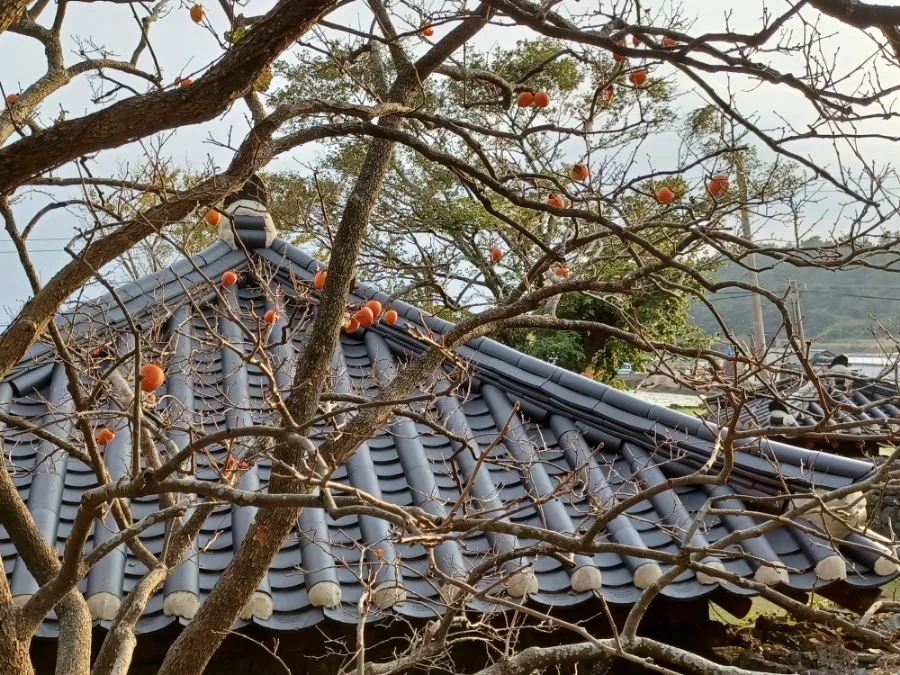 잎 진 초겨울, 감나무에 휘늘어진 감이 서재 지붕 위에서 바람 따라 이리저리 흔들거렸다.