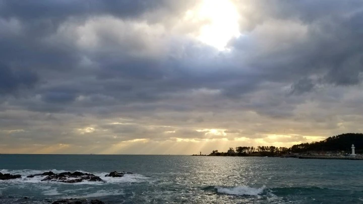 아니 구름 잔뜩 낀 저런 하늘에서 뭔 일출 구경이래유? 지금 바닷가에 왔는데 흔치 않은 틴들현상을 만났으니 춥지 않게 단도리하고 무조건 빨랑 나와보란다.