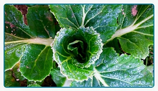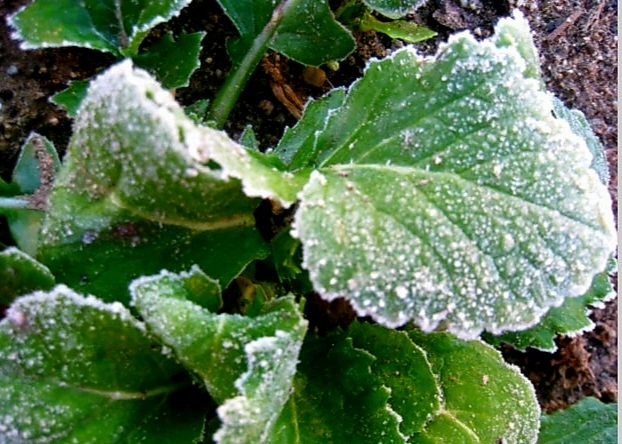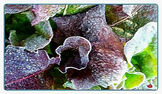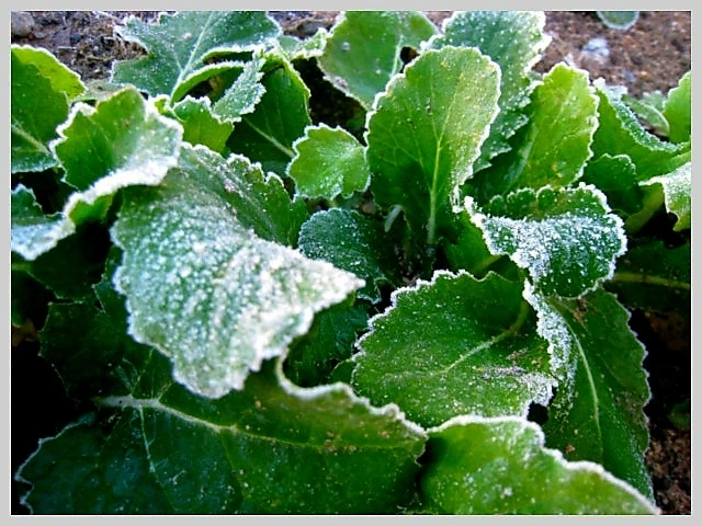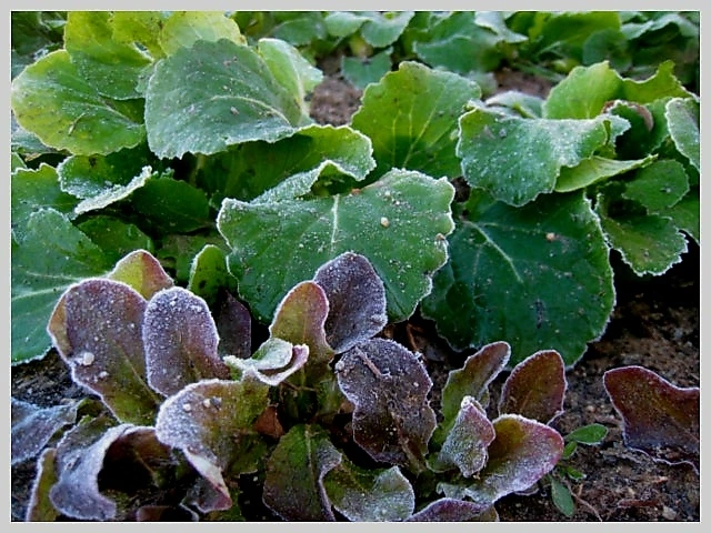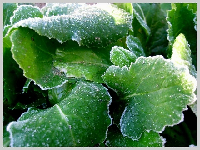 이른 아침 텃밭에 나갔다가 된서리 하얗게 덮어쓴 채소 잎들을 보았습니다.