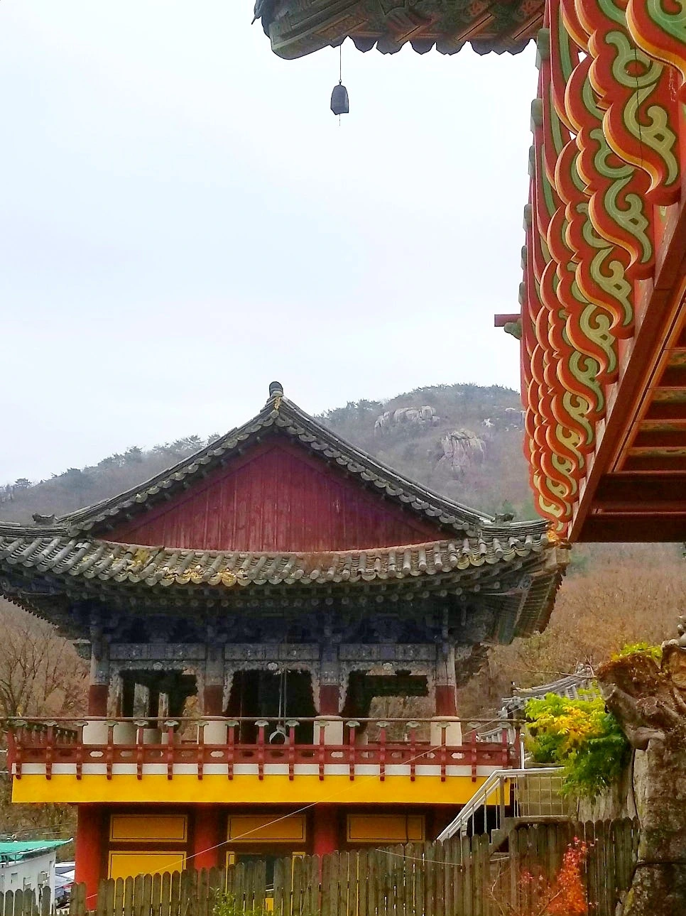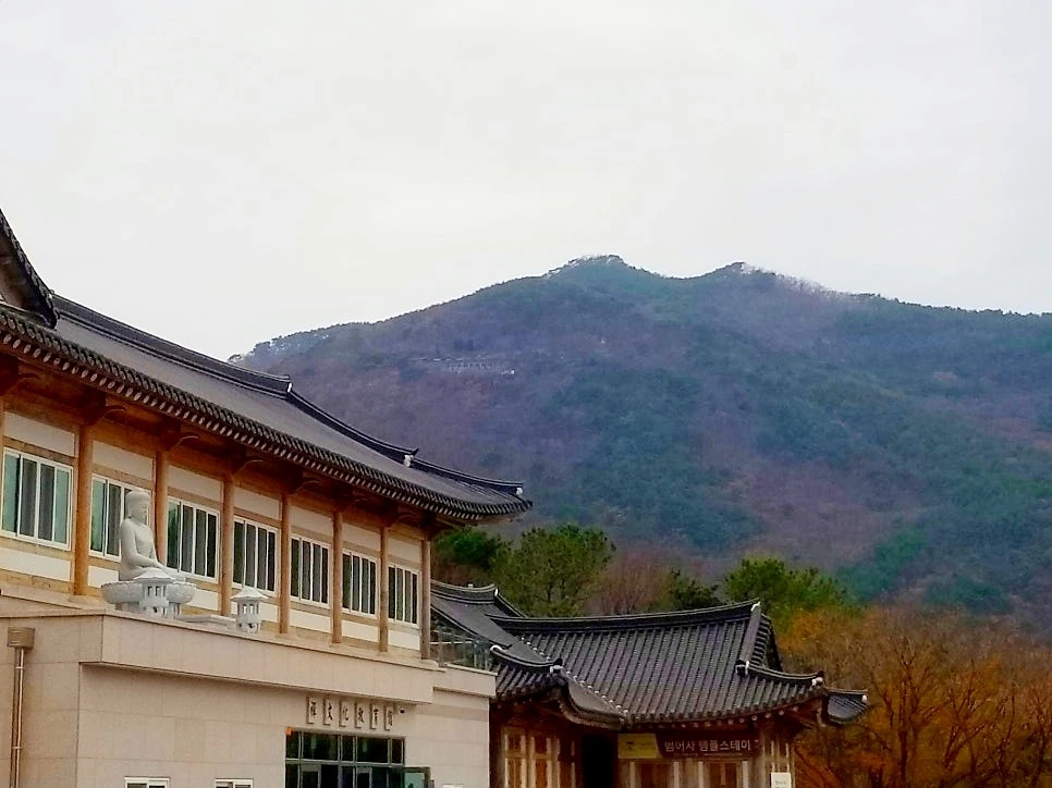 범종각이 아닌 보제루 하단 옆자리 건물에서 지심 깊이 스며드는 범종소리 울렸다, 정상에 바위로 된 금샘이 있는 금정산이 저만치서 이마 드러내고.