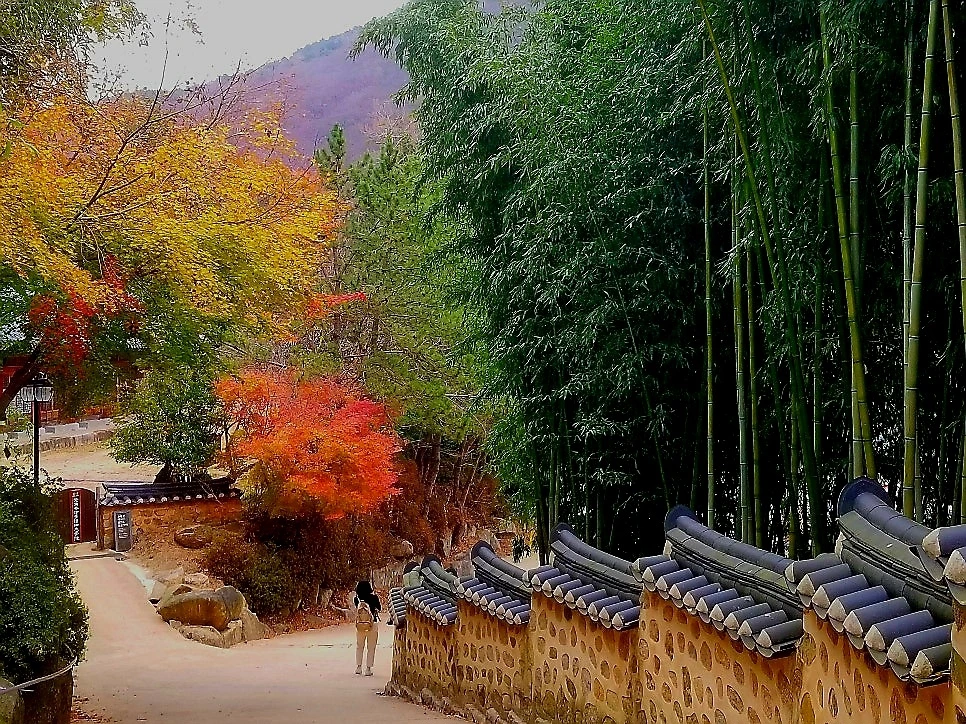 대숲과 단풍이 대비도 선명히 조화 이룬 11월 말의 범어사 언덕에 고개 갸웃 내민 마지막 단풍빛 꽃처럼 곱다.