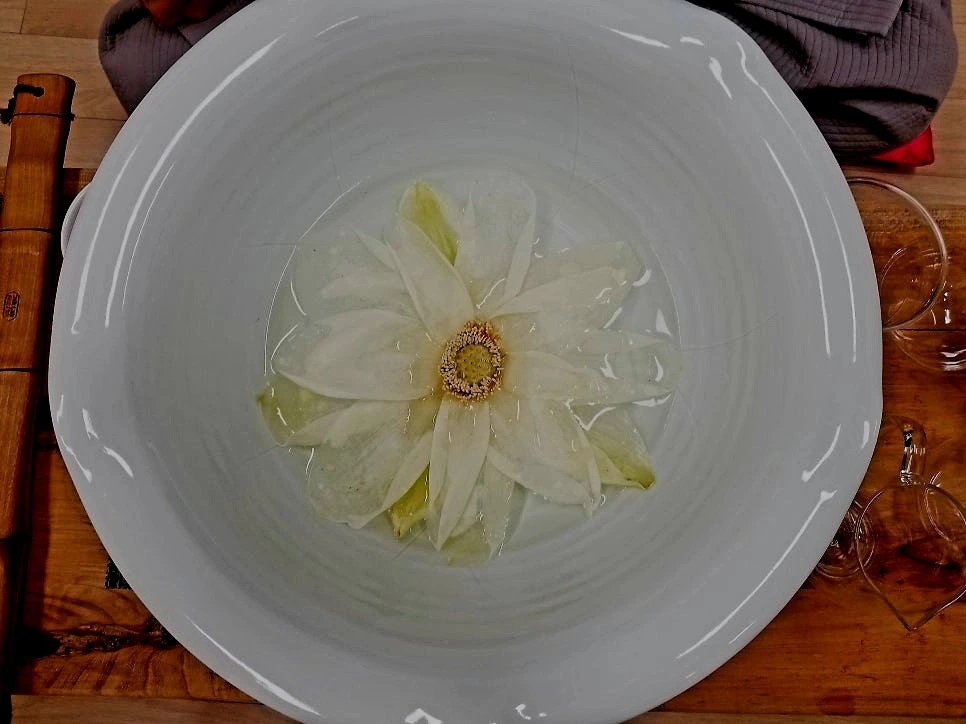 70도 정도로 식힌 물에 냉동시킨 연꽃 봉오리를 올리고 조금씩 보온병의 물을 따루어 보태자 얼었던 이파리가 사르르 피어나며 연꽃이 만개했다,