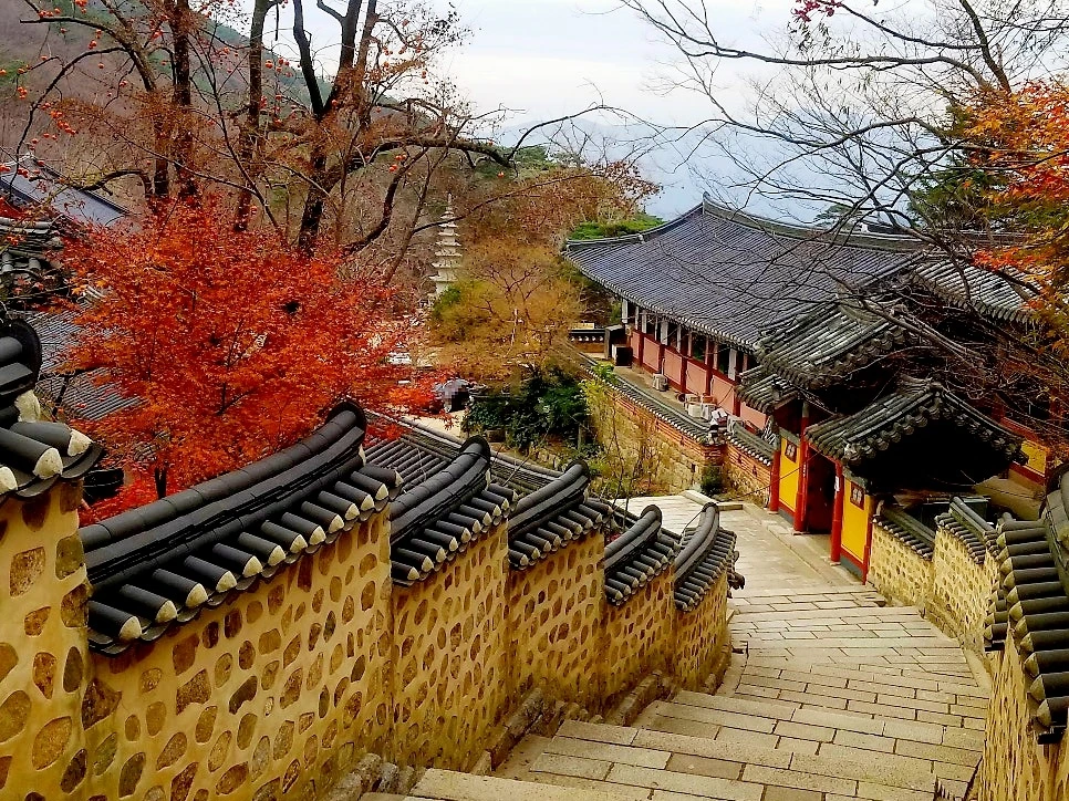 보물 제250호로 지정된 통일신라시대 삼층석탑과 고색창연한 이층 누각인 범종각 색채야말로 만추 분위기와 제대로 어우러지고.