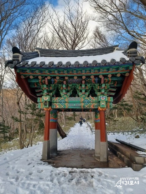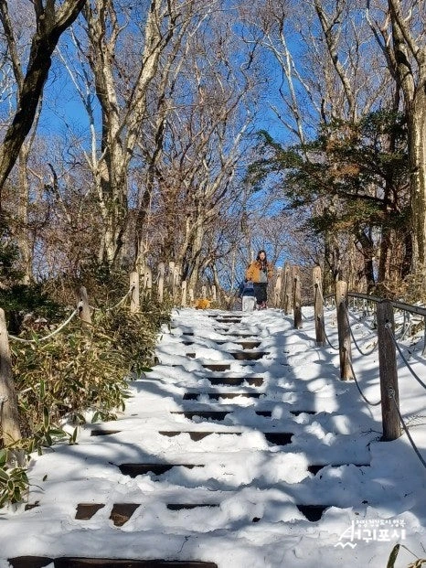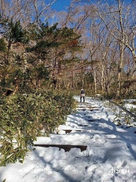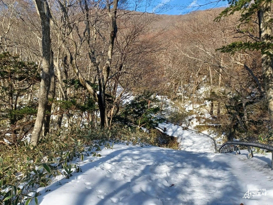평상시는 계단으로 죽 이어진 길이라 걷기 버겁지만 눈 덕에 층계가 사라져 오르기도 수월했어요.
