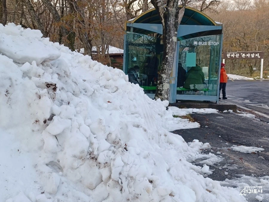 그 통에 등산화 속으로 눈이 들어와 양말은 푹신 젖었지만 20여 분 만에 무탈히 영실 버스정거장에 닿았어요.