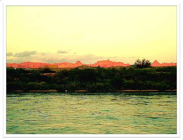 석양이 내리는 콜로라도 강 건너 저 멀리로 가물거리는 붉은 산의 기운.
