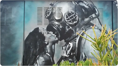 일단 베니스 비치에 닿으면 곳곳에서 눈에 띄는 그래피티의 야생성이 거칠게 다가선다. 젊은이들의 해변답게 스케이트 파크 방향에서 들리는 환호성 하며 붕 떠서 도 넘치게 활기찬 반면, 어수선하고도 무질서한 것이 우범지대 냄새조차 풍긴다. 칙칙한 전체 분위기 자체도 비호감이라 선뜻 움직일 마음이 내키지 않을 정도다. 주말이 아니라서인지 비교적 한산한 거리. 그래도 비치니까 당연히 모래해변이 너르게 펼쳐진 바닷가 쪽으로 향한다,