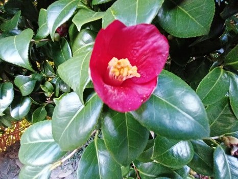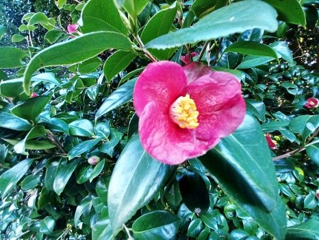기름기 잘잘 흐르는 동백 잎새 사이로 붉은 꽃잎 살몃 연 단정한 자태의 꽃송이 곱다.