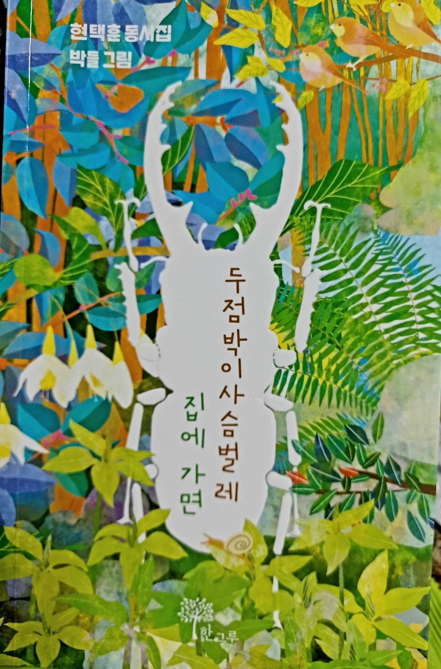 그로부터 받은 첫 동시집을 펼쳐들었다. <두점박이사슴벌레 집에 가면>은 멸종 위기에 처한 곶자왈의 두점박이사슴벌레를 표제로 한 동시집이다. "어렸을 때 놀았던 풀숲에 있는 식물이나 곤충은 모두 이름이 있다. 그 이름부터 먼저 불러준 다음에야 그들과 친구가 될 수 있을 것이다. 그들이 오랫동안 나랑 놀아주면 좋겠다. 작년 여름에 사귄 두점박이사슴벌레 집에 또 놀러 가야지.” 현시인은 사람들 앞에 나서기보다는 이런 말을 하는 게 더 잘 어울릴 거 같은 순수청년이었다. 이슬을, 별을, 구름을, 이끼를, 잘도 아는 그의 맑디맑은 시심이, 잊고 지낸 옛 친구처럼 반가웠는데. 이리도 여릿여릿 정겨운 표현을 쓰는 현시인의 다른 시는 뼈마디 녹는 시린 애가였다.