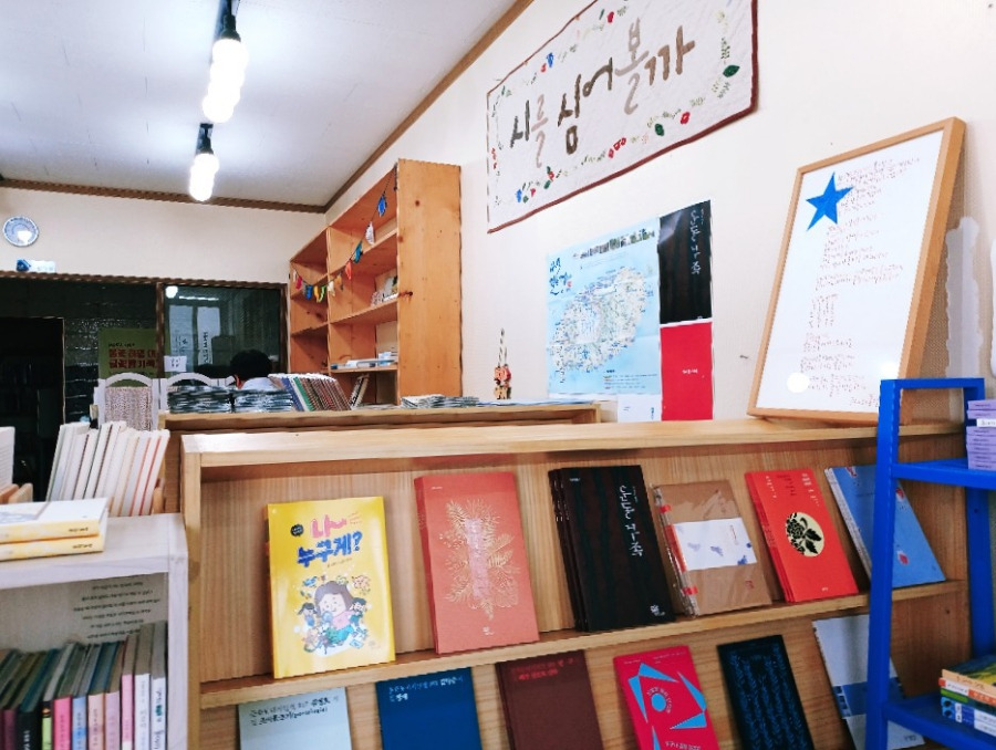 퍽도 다채롭다. 이 같은 부부를 한마디로 정의 내릴 수 있을까. 수줍게 한구석에 숨어있는, 너무 작아 찾아내기 힘든 서점 간판. 반면 첫눈에 확 드는 창에 붙은 포스터엔 6월 14일부터 시월 말까지 여기서 진행되는 '이야기를 잡아라! 나는야 동화 작가'를 안내한다. 차분한 실내에 가지런하게 진열된 약간의 시집과 제주 관련 서적들. 대형서점에 익숙한 시선으로는 책보다 벽보처럼 붙은 '시를 심어볼까'와 4·3 길을 걷다, 란 제주 지도가 크게 부각된다. 부부의 시정신 내지는 계속 나아갈 지향점이 읽힌다 할까.