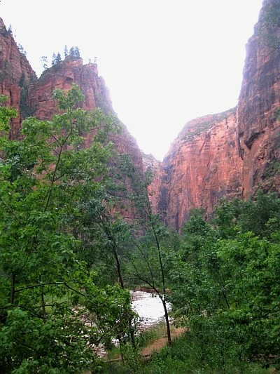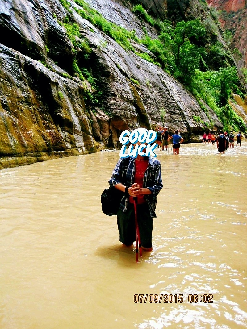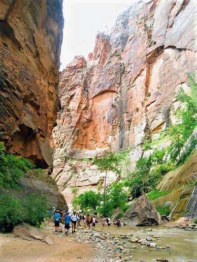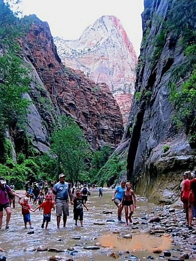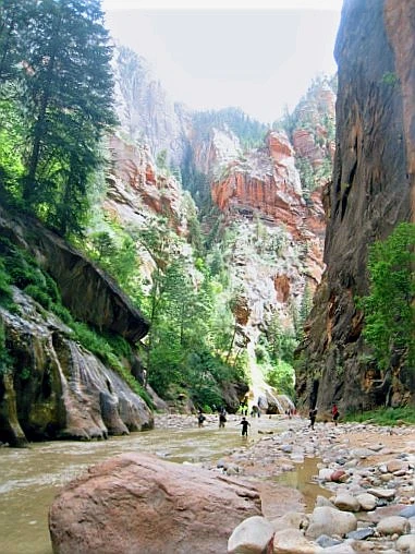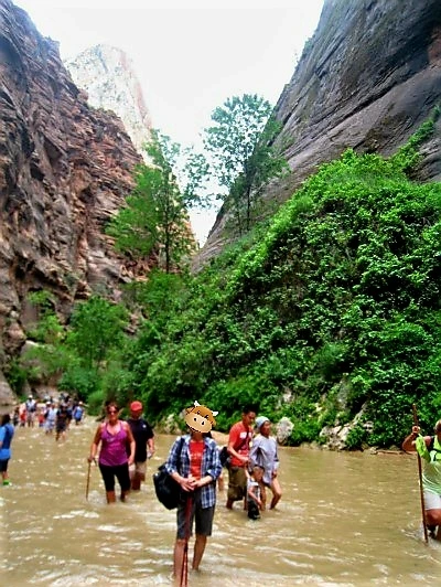 둘째 날 일찌감치 장비 단단히 챙기고 Narrow로 향했다. 버진리버 물길을 따라 시종 걷는 16마일 트레킹 코스라 카메라와 갈아입을 옷과 점심거리인 샌드위치와 간식 등은 배낭 안 지퍼백에 잘 간수시키고 야무친 각오로 양손에 스틱을 들었다. 얕은 곳은 발목이나 적시지만 깊은 데는 가슴까지 온다는 물길이다. 비가 잦은 여름철이라서 시냇물은 맑지 않았으나 개의치 않고 발을 담갔다. 뭉게구름이 가득 낀 하늘에 바람은 선선했고 물도 찼다.