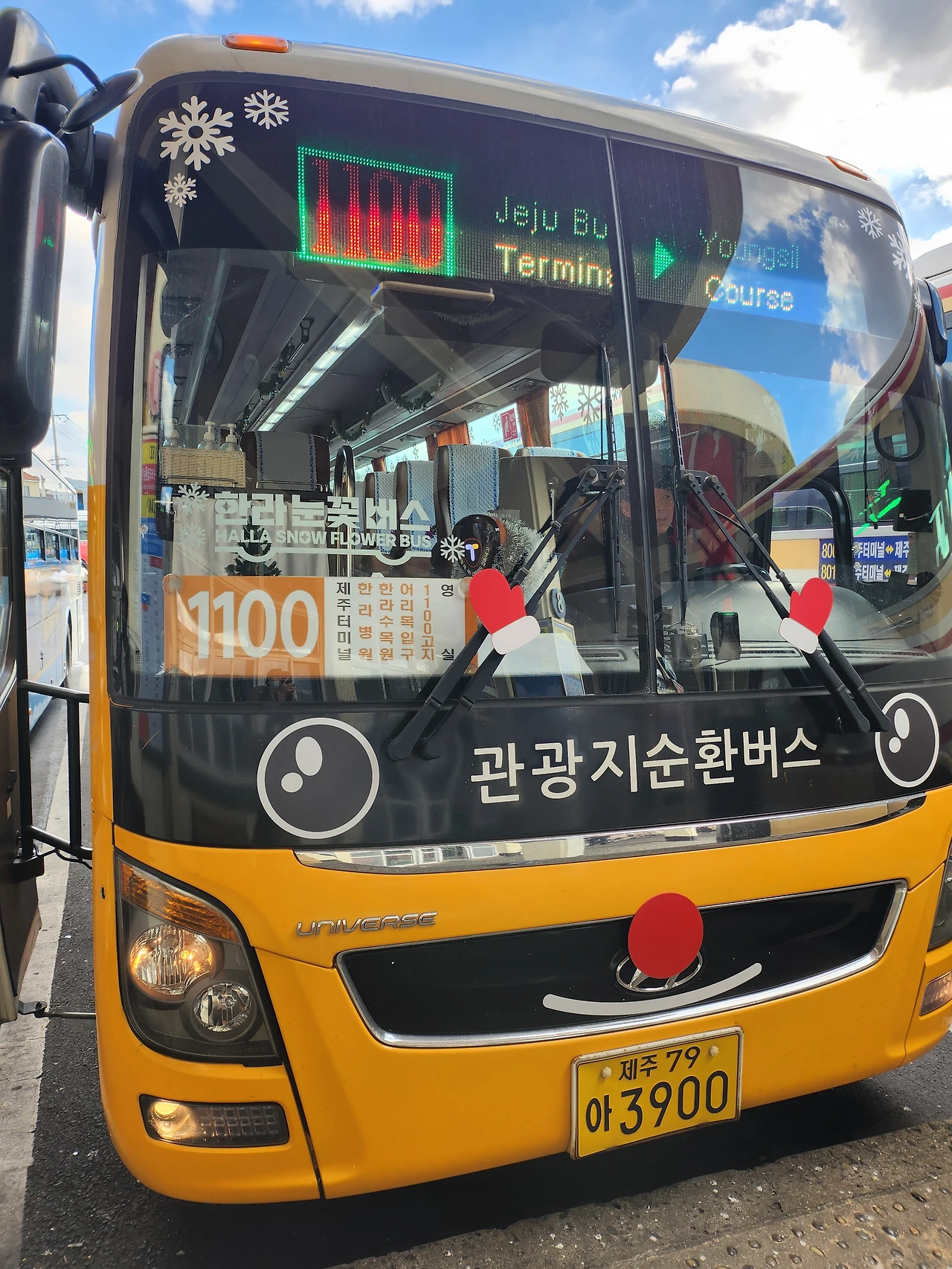 경쾌한 노란색에 새하얀 눈꽃이 그려진, 제주 버스터미널에서 출발하는 1100번과 서귀포에서 출발하는 1100ㅡ1이 그것.