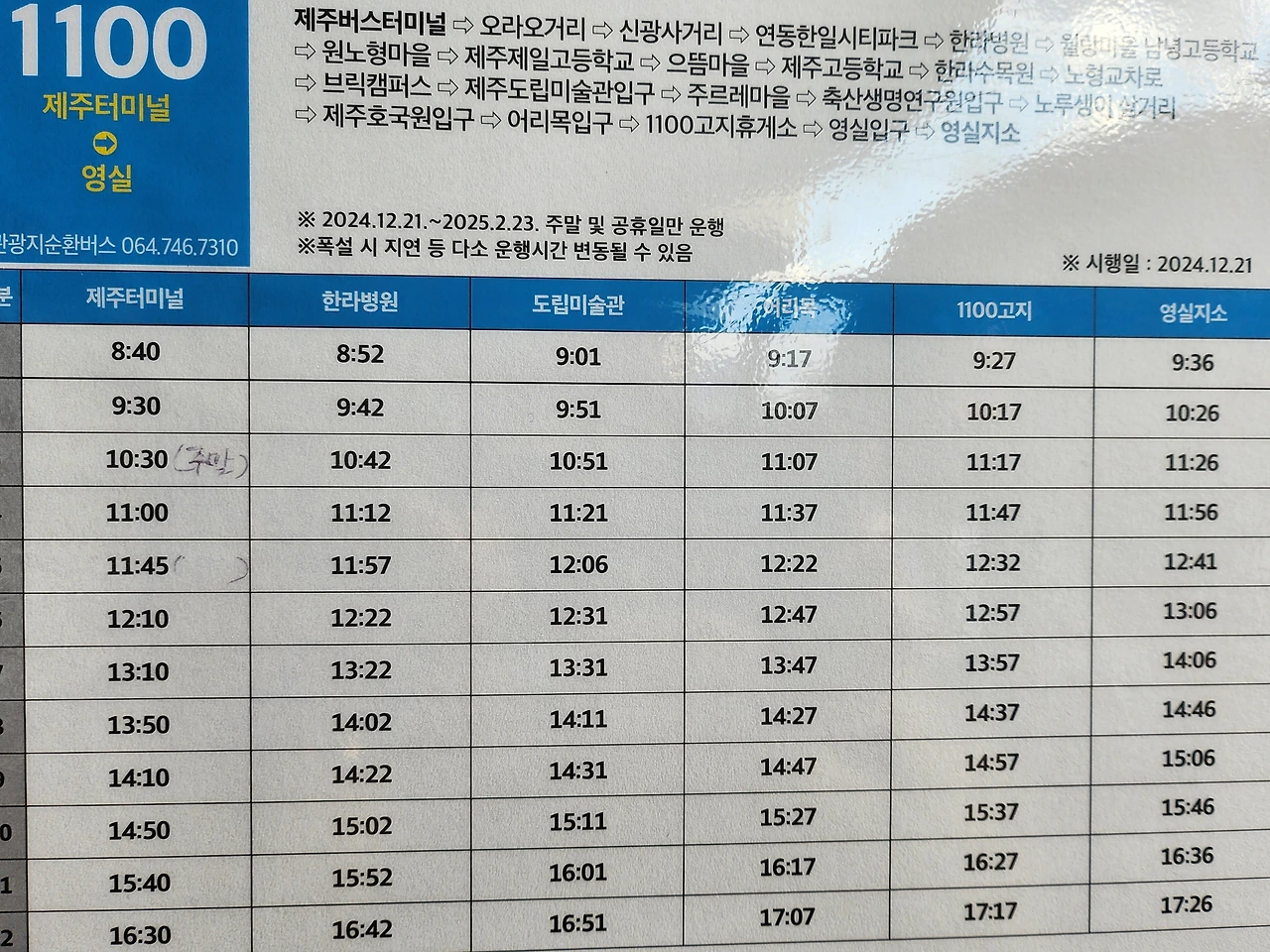 1100번 ‘한라눈꽃버스’는 오전 8시 40분부터 오후 6시 40분까지 하루 12회 왕복 운행하며 요금은 1150원으로 교통카드로만 결제된다.