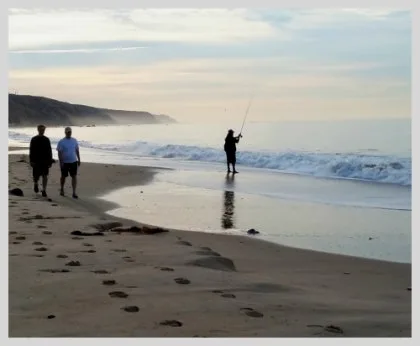라 조깅 즐기는 사람도 있고 파도에 발 담근 채 낚시 삼매에 빠진 사람도 있다.