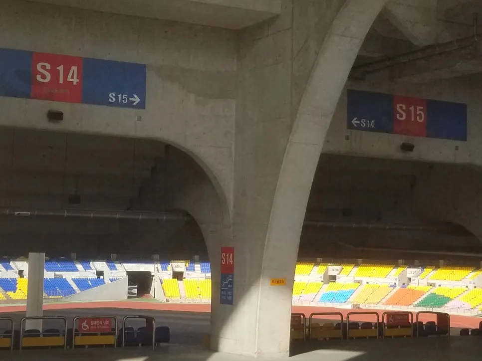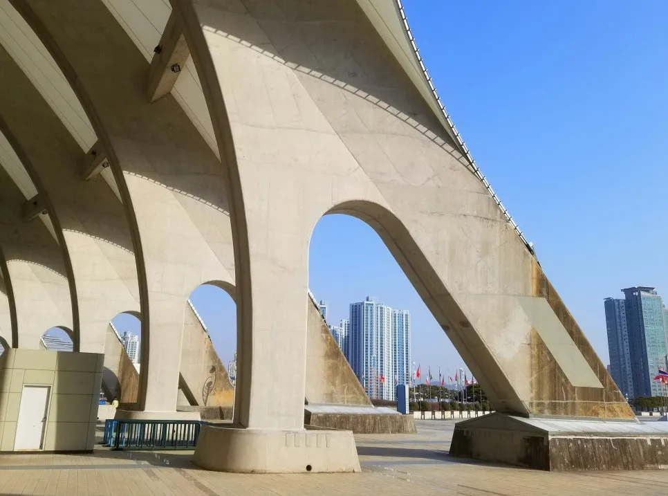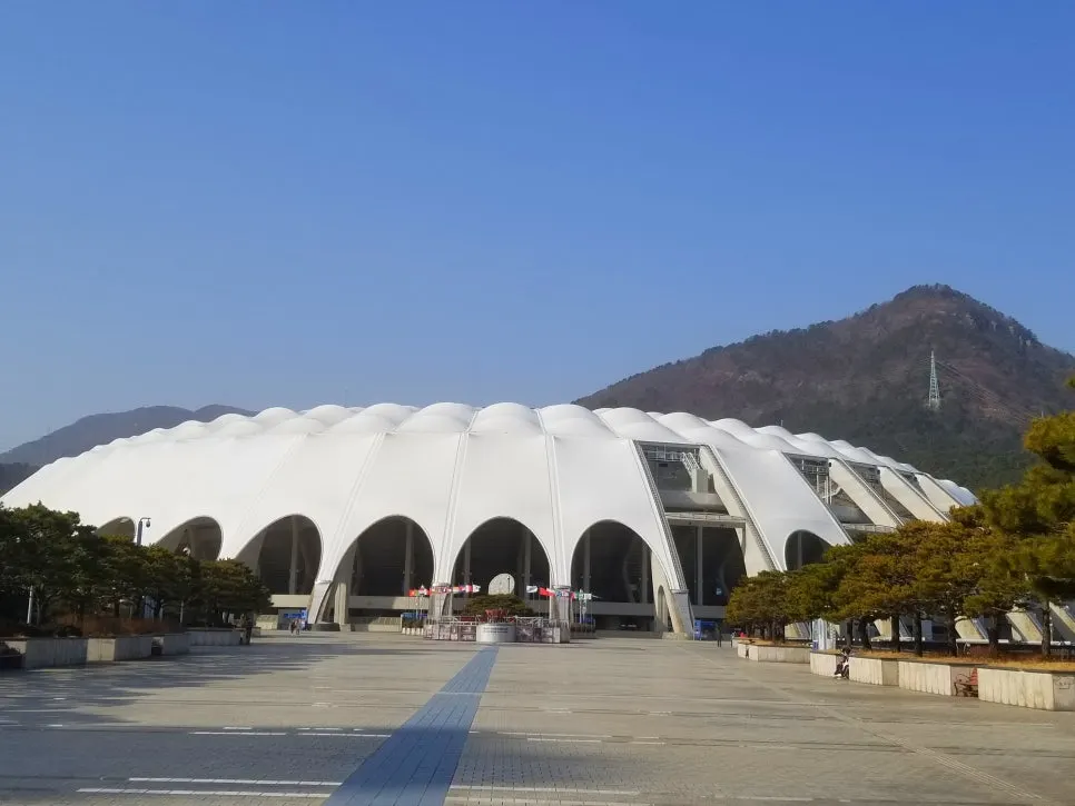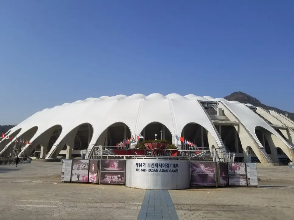2001년 9월에 개장한 Busan Asiad Main Stadium은 2002년 아시안 게임의 주 경기장으로 건설되었다. 부산종합운동장의 주 경기장으로 활용되고 있으며, 천연잔디 필드와 우레탄 트랙이 갖춰져 있는 다목적 경기장이다. 부산아시아드주경기장, 보조경기장, 사직야구장, 사직실내체육관, 사직실내수영장, 체조체육관, 테니스장, 론볼 경기장, 궁도장 등 여러 스포츠 경기 시설이 갖춰져 있다. 인상적이었던 하얀 지붕은 반개방형 케이블 돔 구조로, 지붕을 떠받친 48개의 콘크리트 기둥은 사통팔달을 뜻하며 기둥 형태는 사람 인(人) 자를 나타낸다고. 경기장 출입구마다 벽을 없애 세계와 우주를 호흡하자는 의미를 담았다던가. 고개를 빼고 안을 들여다보니 색색이 경쾌한 경기장 실내 상층부 따라 2,000럭스로 설계되었다는 조명등이 묵직했다.