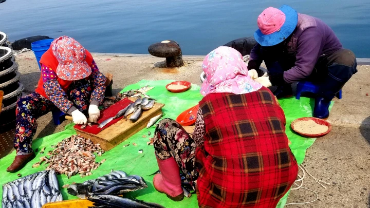 길바닥에 냉동꽁치를 부려놓고 아낙들 둘러앉아 적당한 크기로 썰어둔 무더기가 수북수북했다.