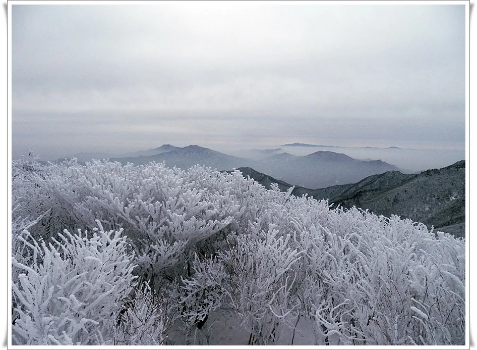 주목과 철쭉 군락지를 지나 완만한 산기슭을 조금 오르니 금세 태백산 정상이다. 고산 다운 웅장미는 있으나 산 자체는 평범한 육산으로 자욱이 이어지는 산록이 발치에 엎드려 있다. 능선 따라 이어진 함백산, 백암산, 일월산, 청량산, 역시 산악국답다. 반도의 중추를 이루는 태백산맥에 소백산맥이 연달아 줄기를 쳐 보이는 것마다 산, 산이다. 하얗게 눈을 인 준봉 준령이 한결 신비롭고 장엄하게 보인다.
