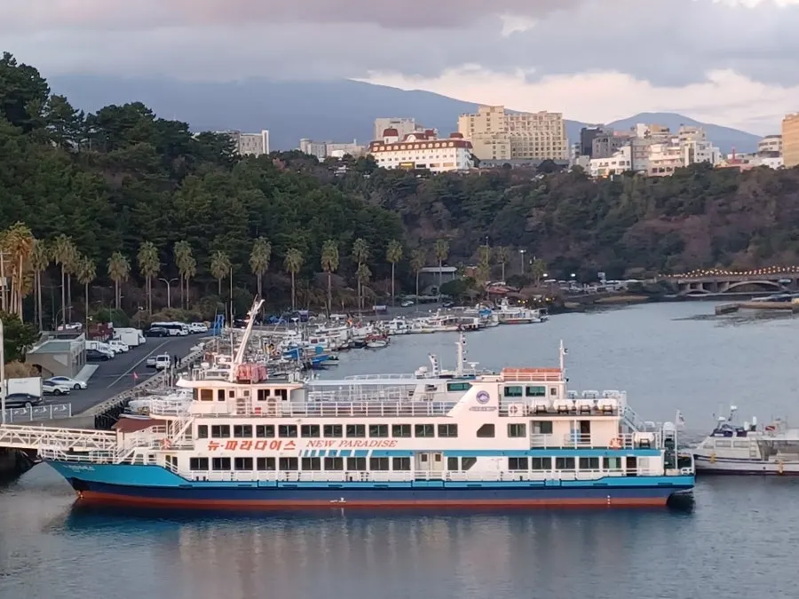 법환포구와 강정해안 그리고 아스라이 산방산 윤곽이 잡힌다.