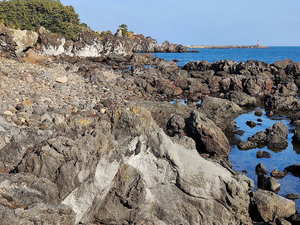 요 며칠 대기는 갑갑할 정도로 희뿌얬다. 해무 잔뜩 낀 양 미세먼지 심했으며 하늘도 우중충했다. 태양마저 그 빛을 잃고 희끄무레한 채 건공 중에서 겨우 존재를 알릴 뿐이다. 마치 안개 깊은 날 수은등처럼 초점도, 촉수도 낮게. 소설 The Road 배경 하늘에 가깝다면 과장이 심하겠지만 얼추 비슷한 상황. 한겨울임에도 가시거리가 매우 짧았고 한라산도 바다도 다 희미했다. 중국발 미세먼지는 유해한 중금속 투성이라고 하니 마스크 착용만으로 안심이 안된다. 강한 편서풍의 영향으로 봄철에는 더 탁하던 공기다. 요사이도 그못지 않게 대기의 질이 안 좋아 창문을 열어 환기시키는 일도 자제했고 외출 역시 삼갔다. 며칠 만에 모처럼 하늘빛 푸르게 깨어났기에 가까운 보목포구까지 걸었다. 바다가 보이는 거처에서는 쾌청하다 여겼는데 백록담이 딴 나라 풍광이듯 아슴하게 떠올라 낯설었다. 북동풍이 불었고 대기질 지수는 보통이었다.