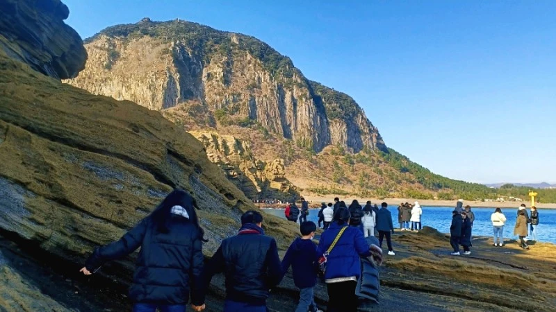 180만 년 전 수중 폭발로 형성된 길이 600미터, 높이 20미터에 걸친 응회암층 해벽을 따라 용머리를 한 바퀴 돌아본다.