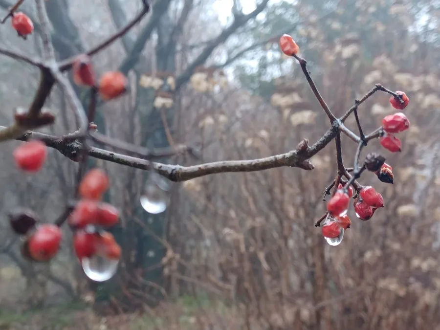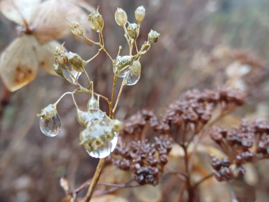 느릿느릿 걸으며 비로 인해 생기로워진 이끼 무리도 사진에 담아보고 마른 수국꽃 이파리며 열매에 매달린 물방울도 찍어본다.