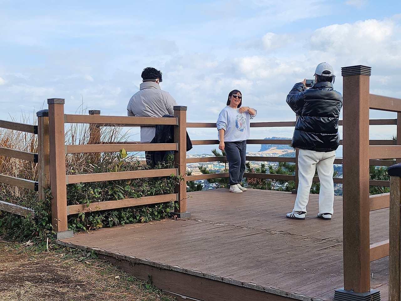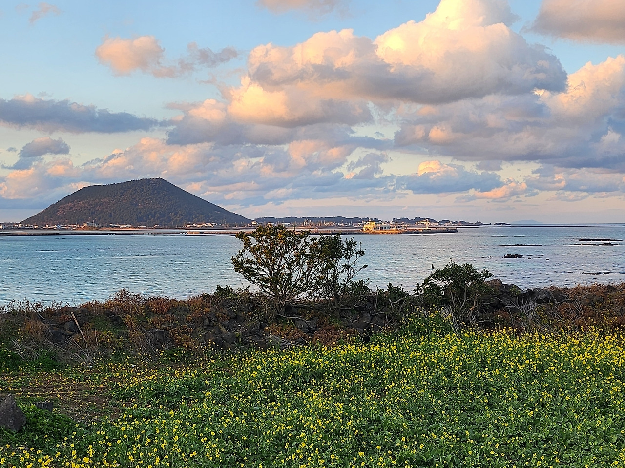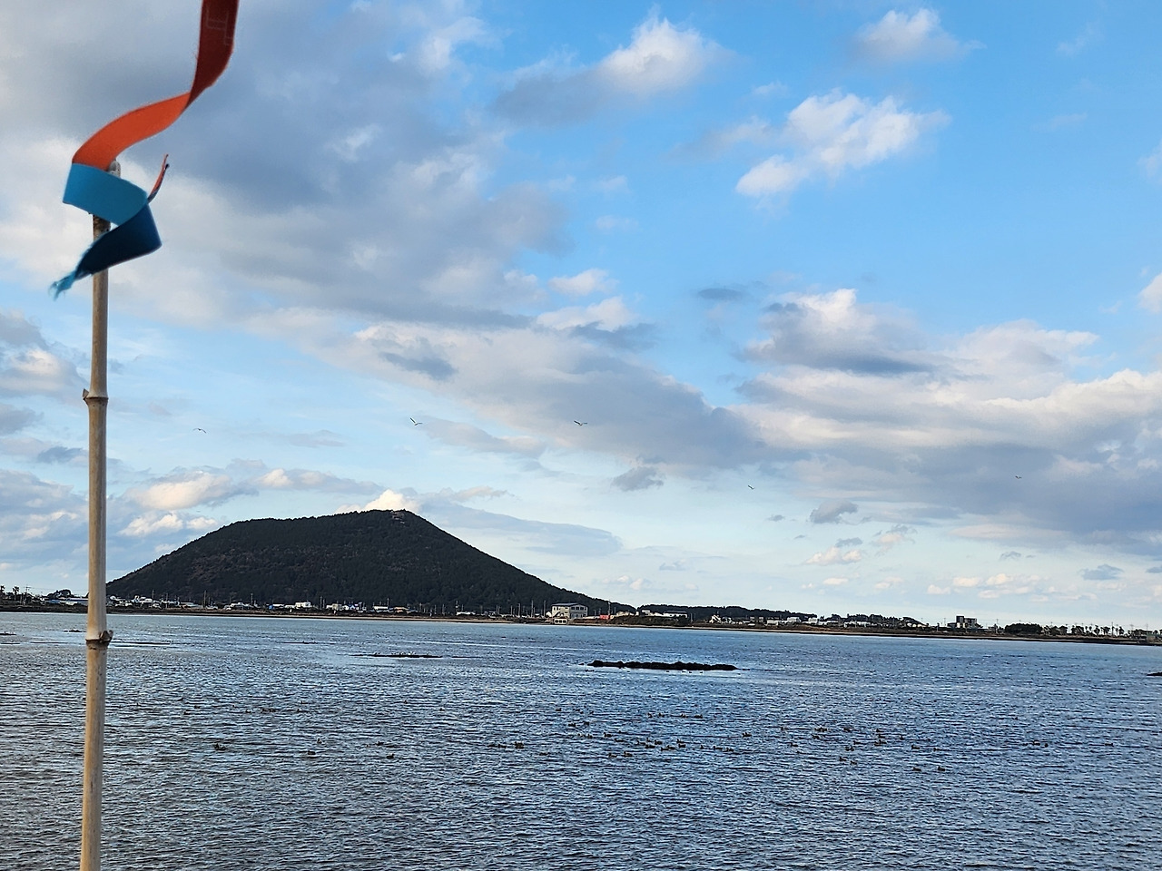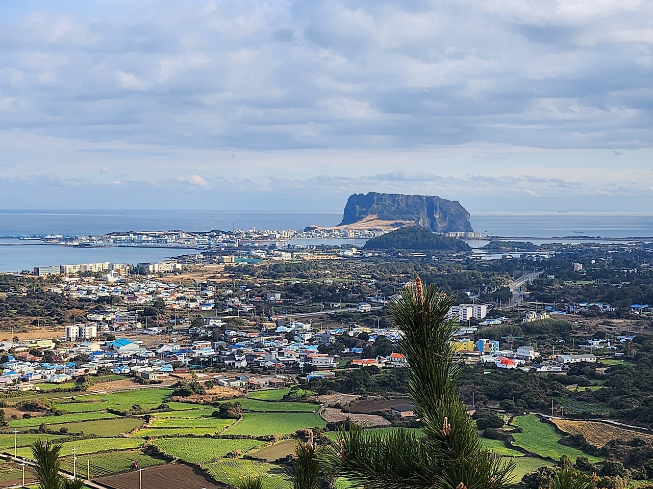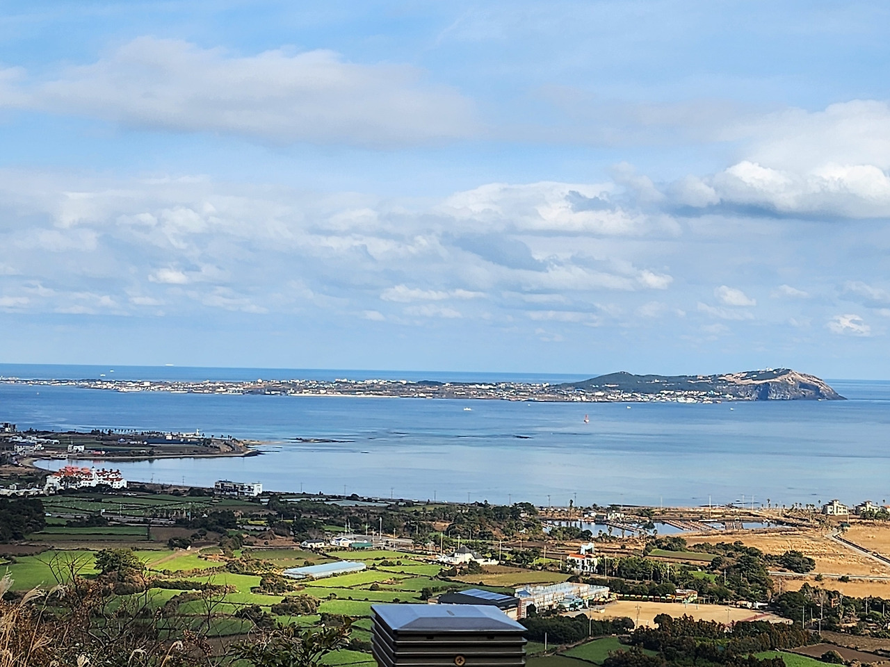바다 건너로 지미봉이 보이고 동쪽바다에는 우도가 떠있으며 저만치 성산일출봉도 드러났고요.