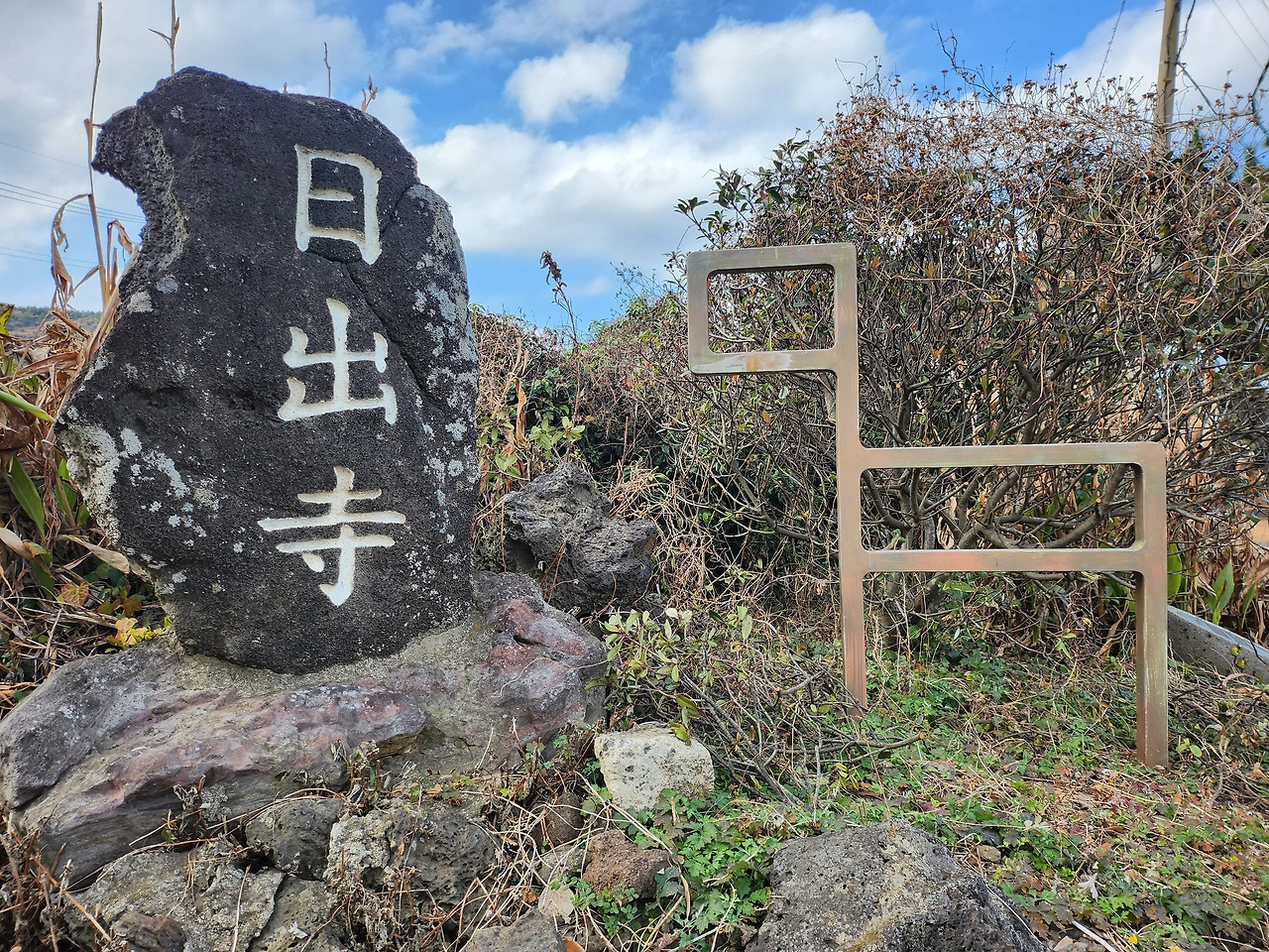 큰 길가에 올레길 간세가 일출사라는 절 표지석과 나란히 서있었고 뒤편으로는 길쭘한 오름이 보였어요.