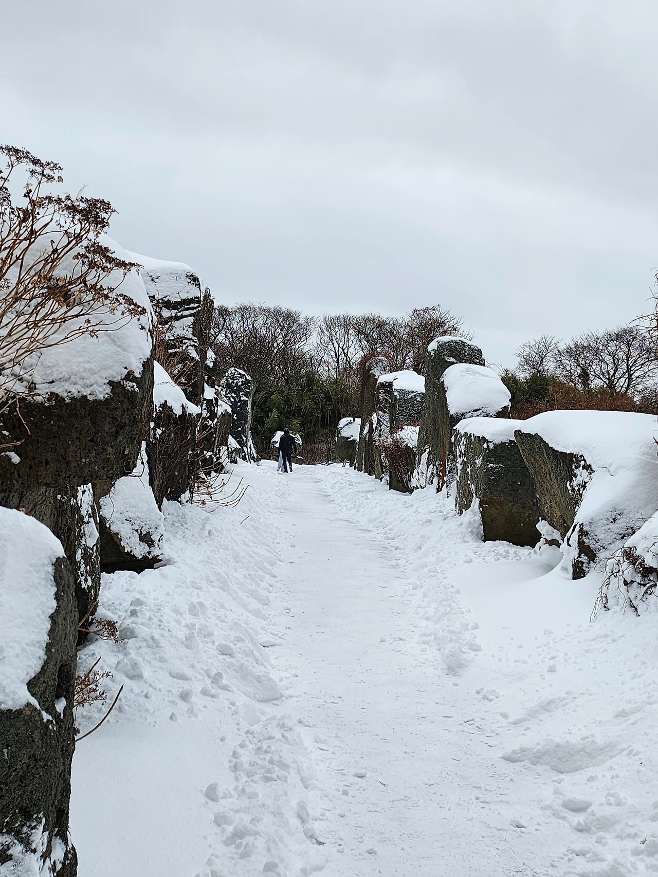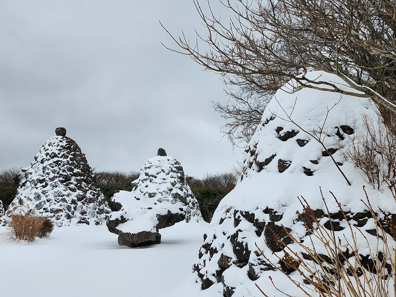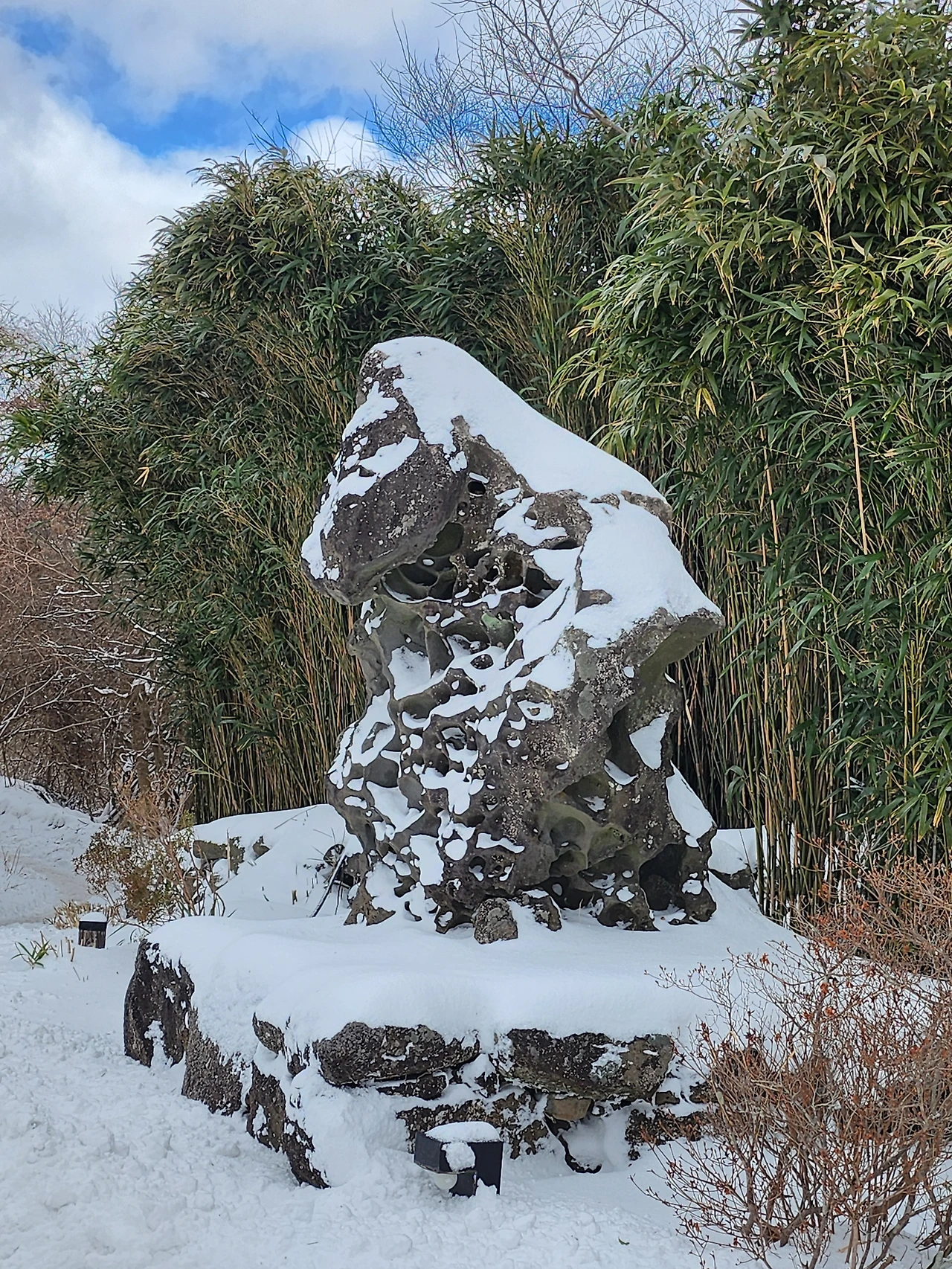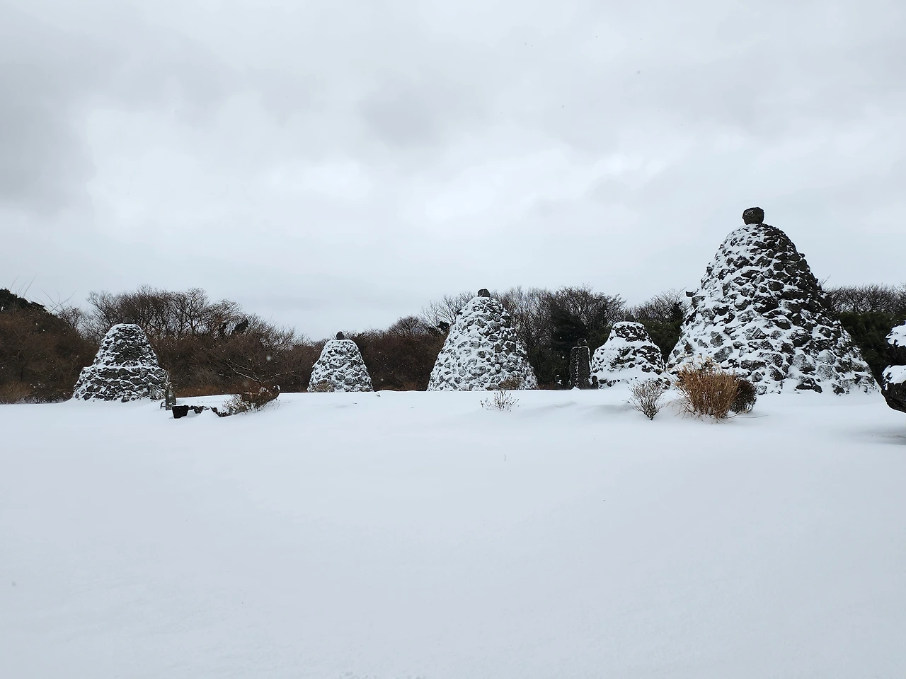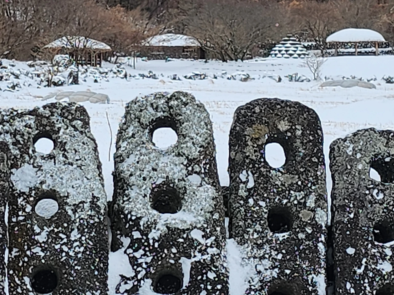 오직 야외에서 까만 현무암과 백설이 조응하며 빚어내는 흑백화폭만을 감상하기로.