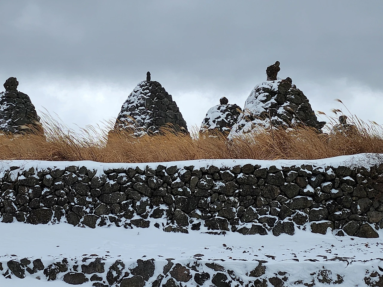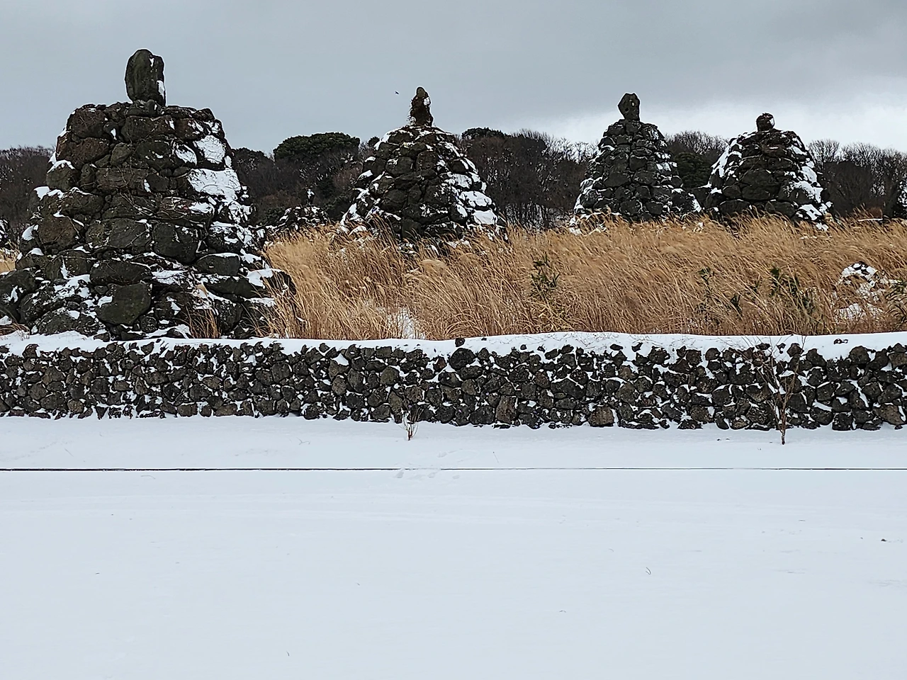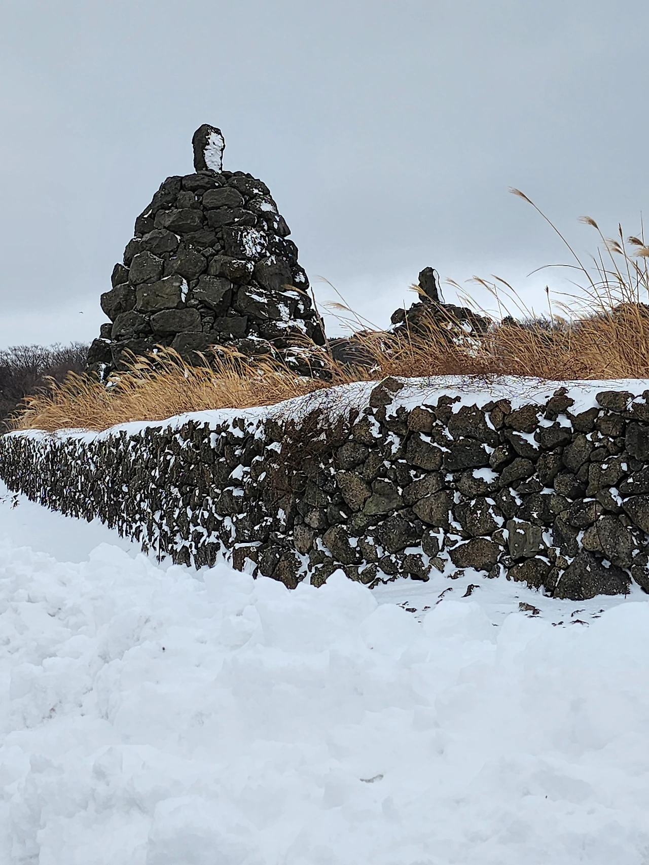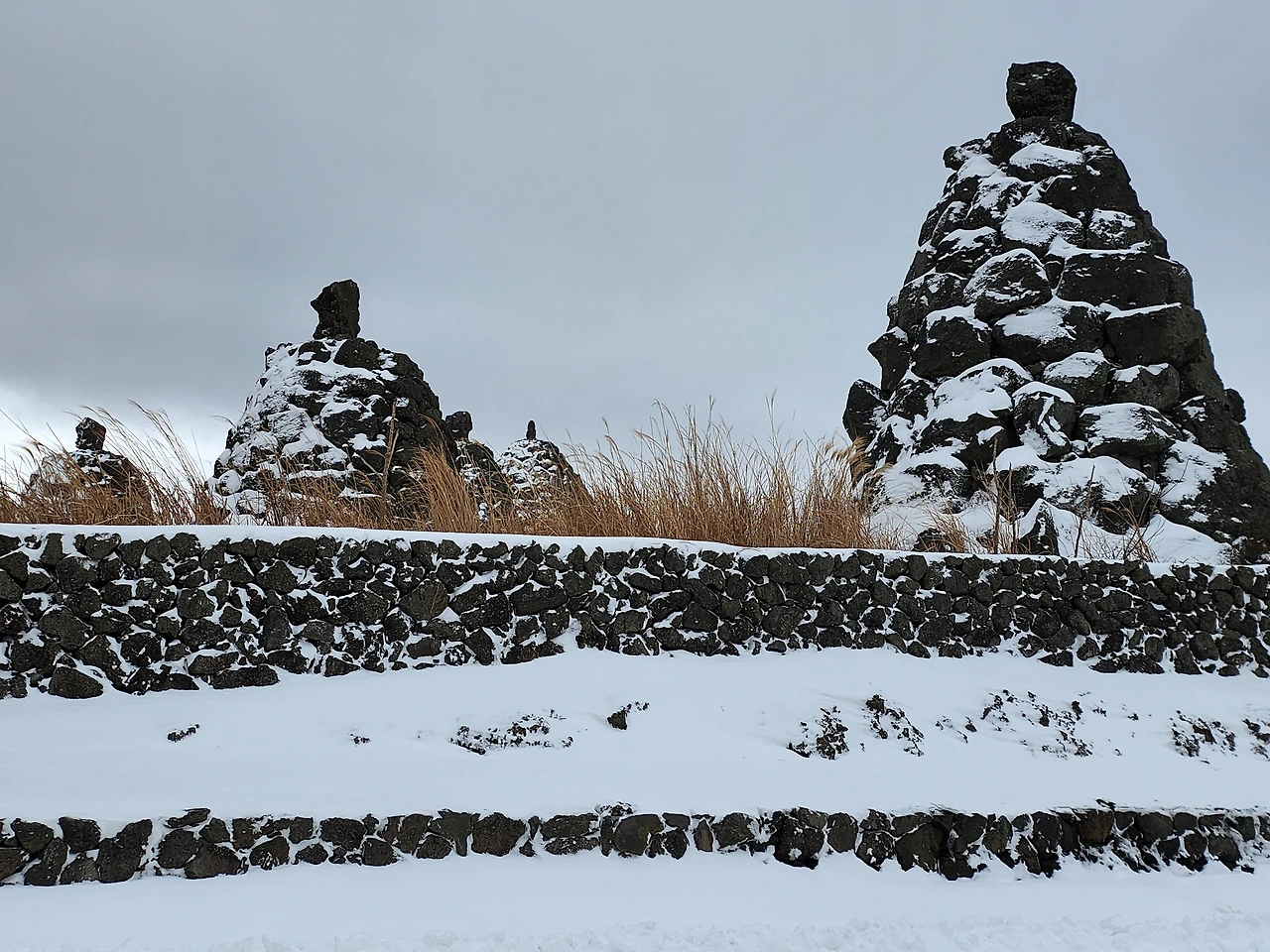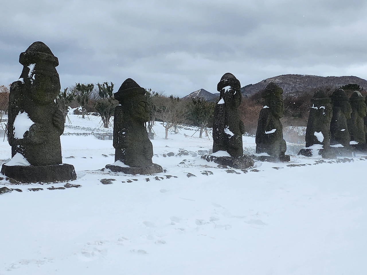 오직 야외에서 까만 현무암과 백설이 조응하며 빚어내는 흑백화폭만을 감상하기로.