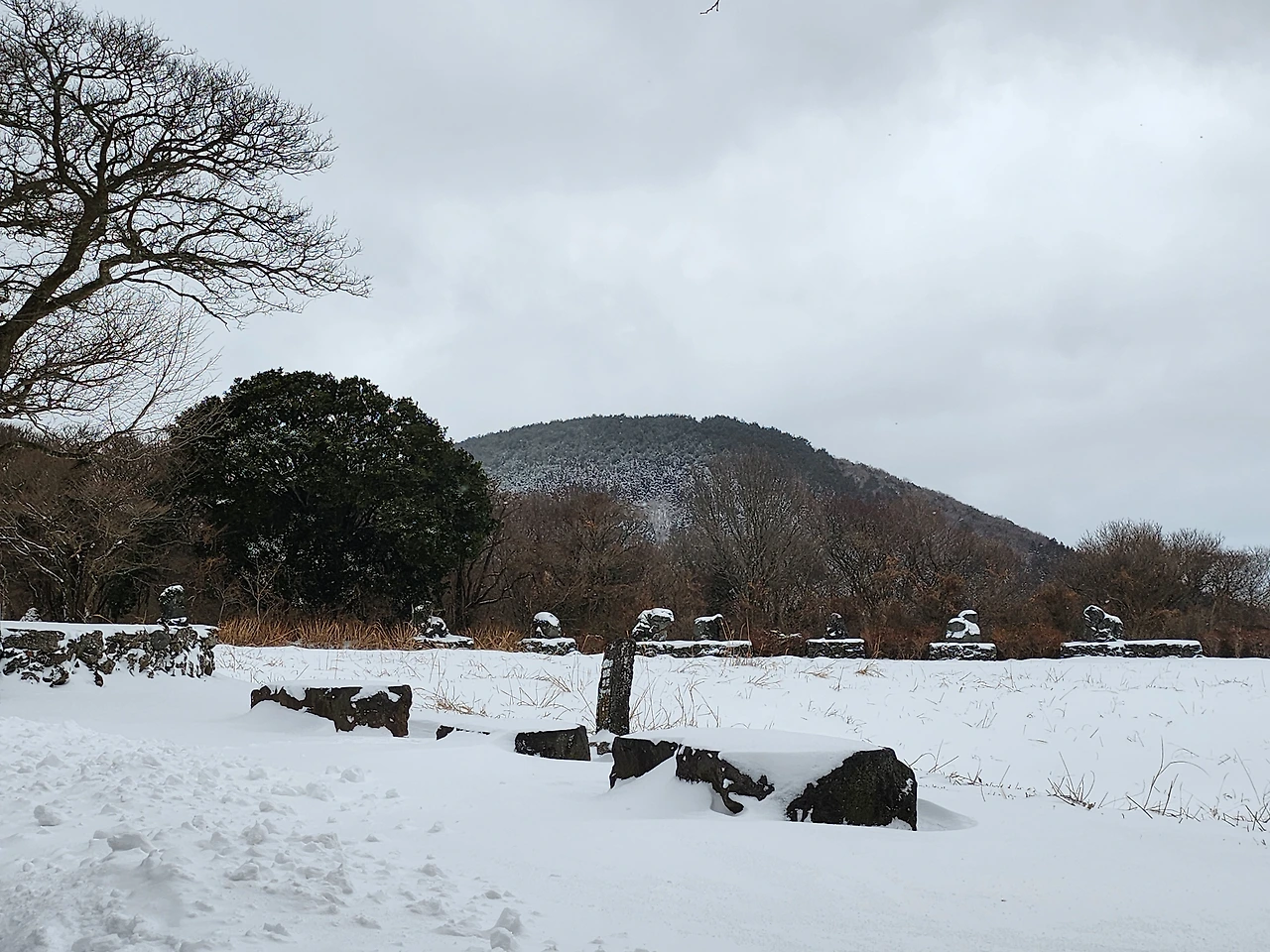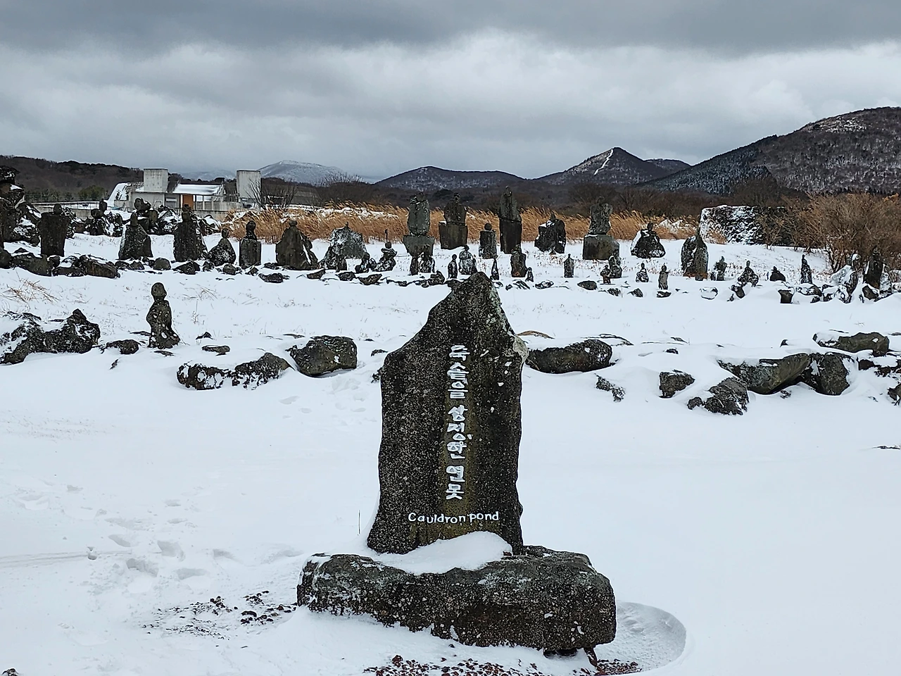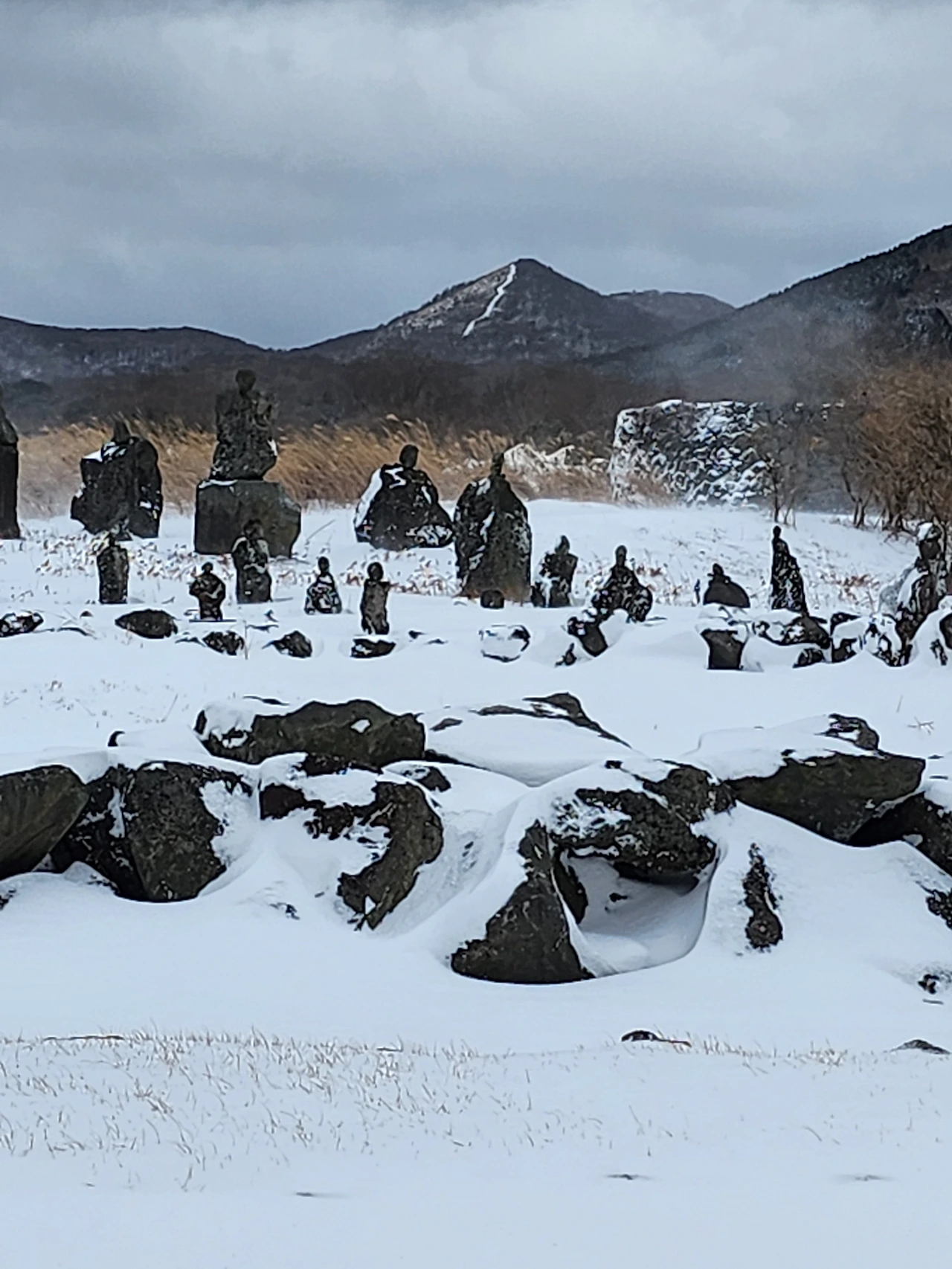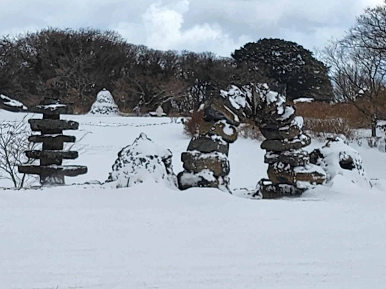 오직 야외에서 까만 현무암과 백설이 조응하며 빚어내는 흑백화폭만을 감상하기로.