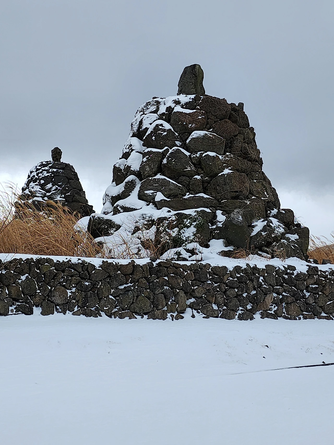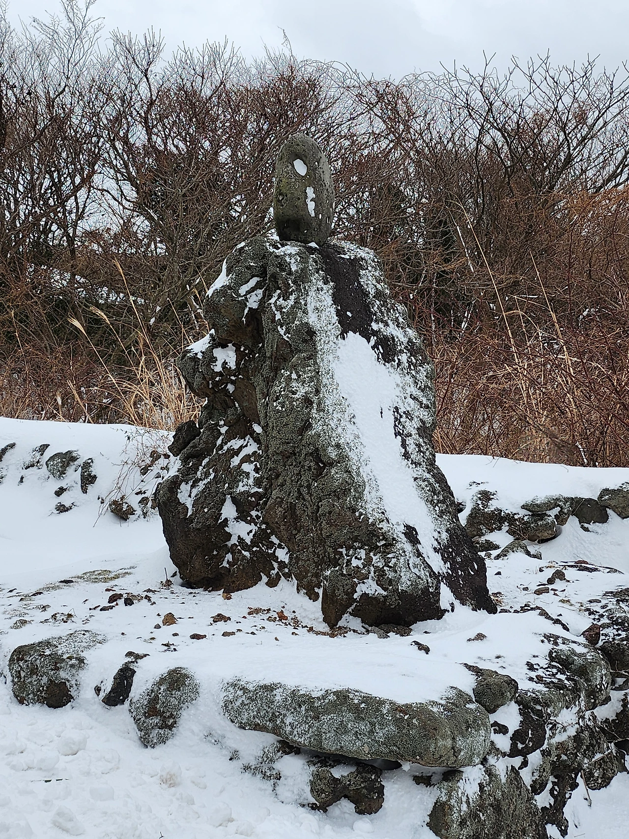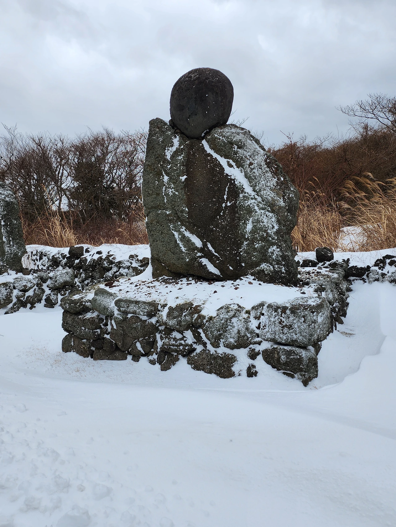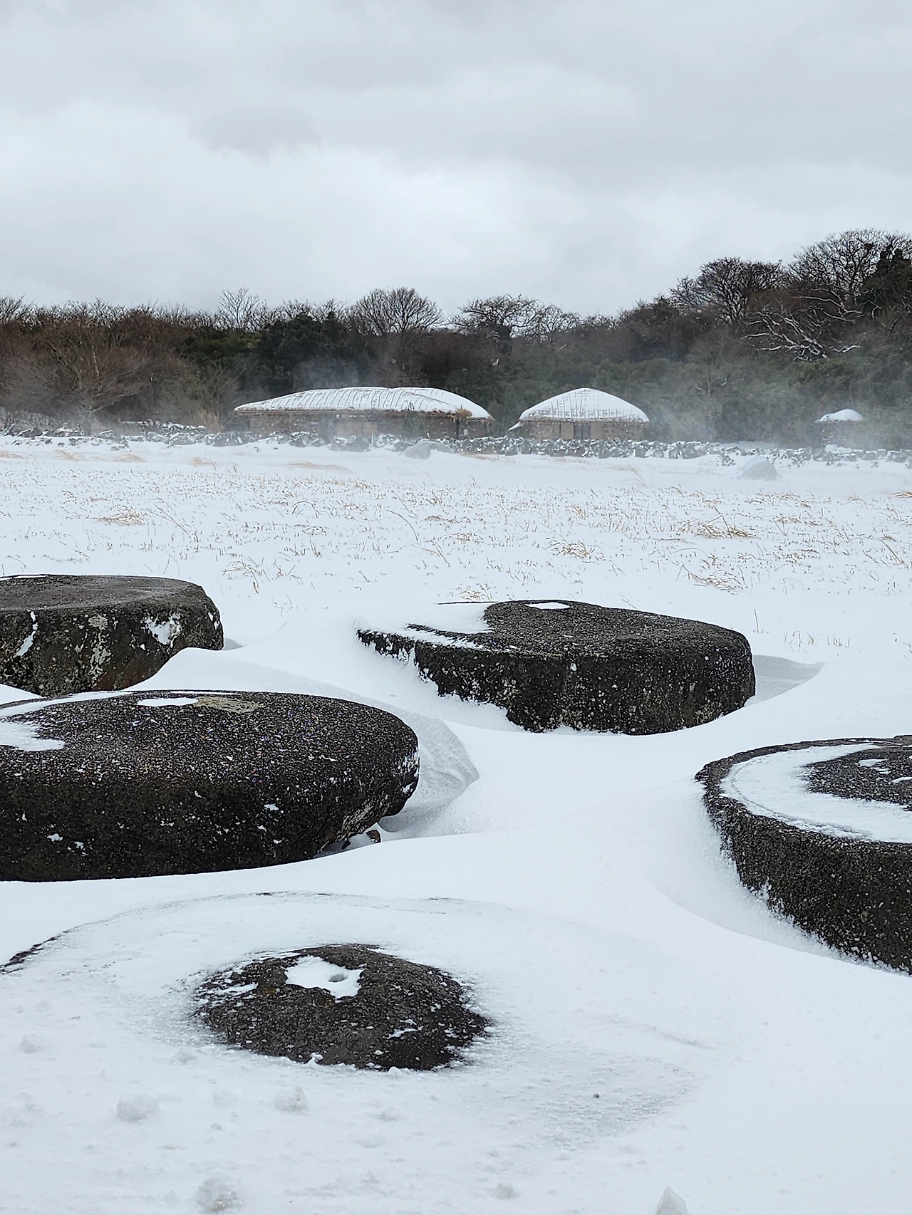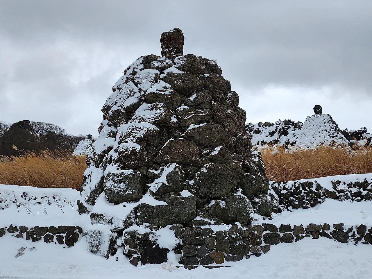 오직 야외에서 까만 현무암과 백설이 조응하며 빚어내는 흑백화폭만을 감상하기로.