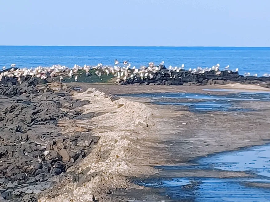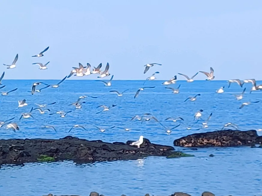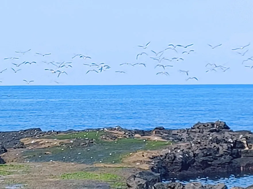 포구 옆, 갈매기 무리가 바윗전에 앉았기에 조심스럽게 움직였어도 놀라 일제히 날아오른다.