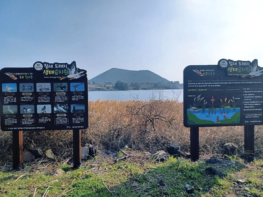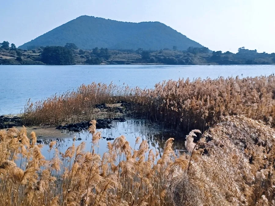 지미오름을 배경으로 한 물가는 탐스러운 마른 갈대에 감싸여 아늑했다.