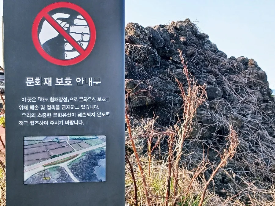 동쪽 하도 귤동 바닷가도 마찬가지라 예외 없이 백성들 지키려 바윗돌로 둘러쌓은 환해장성.