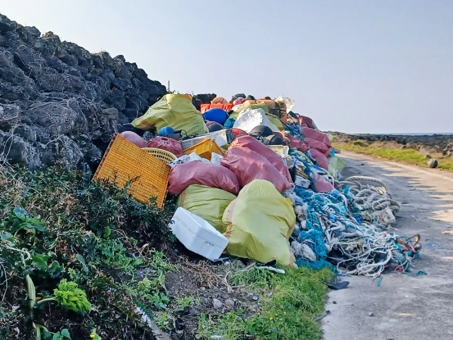 해양 쓰레기를 수거해 장성 뒤편에 볼썽사납게 한가득 쌓아뒀다.