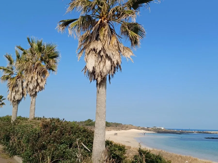 남태평양 섬 풍경이듯 활처럼 휜 은모랫벌 그리고 피콕블루, 민트 블루, 베이비 블루에 청남빛인 바다색 정녕 환상적이었다.