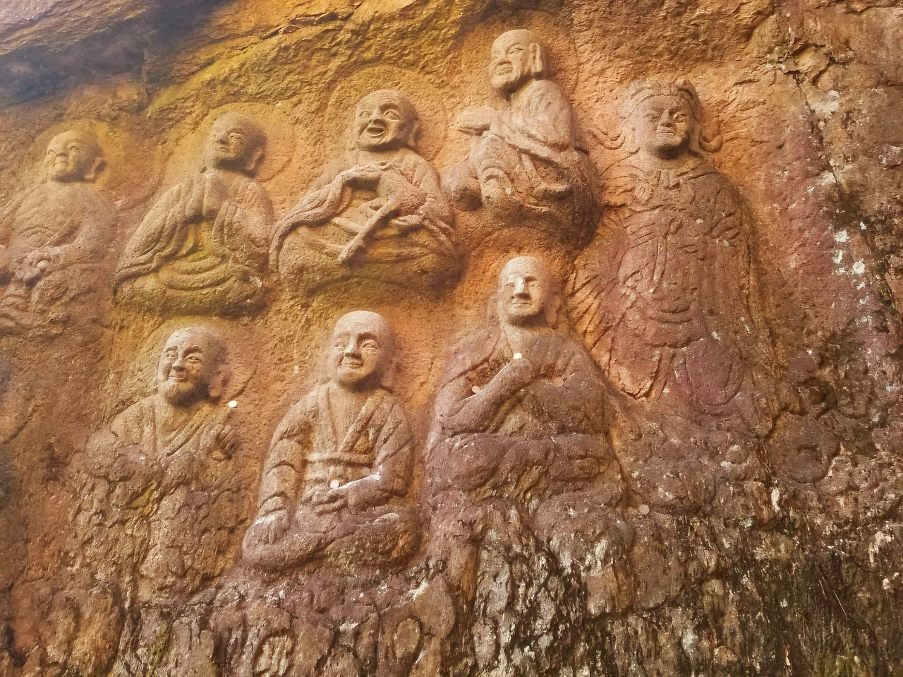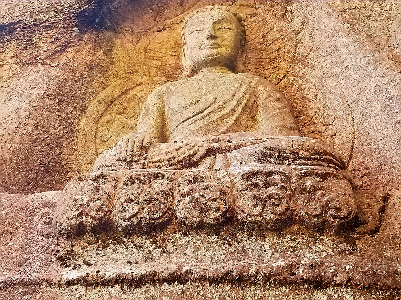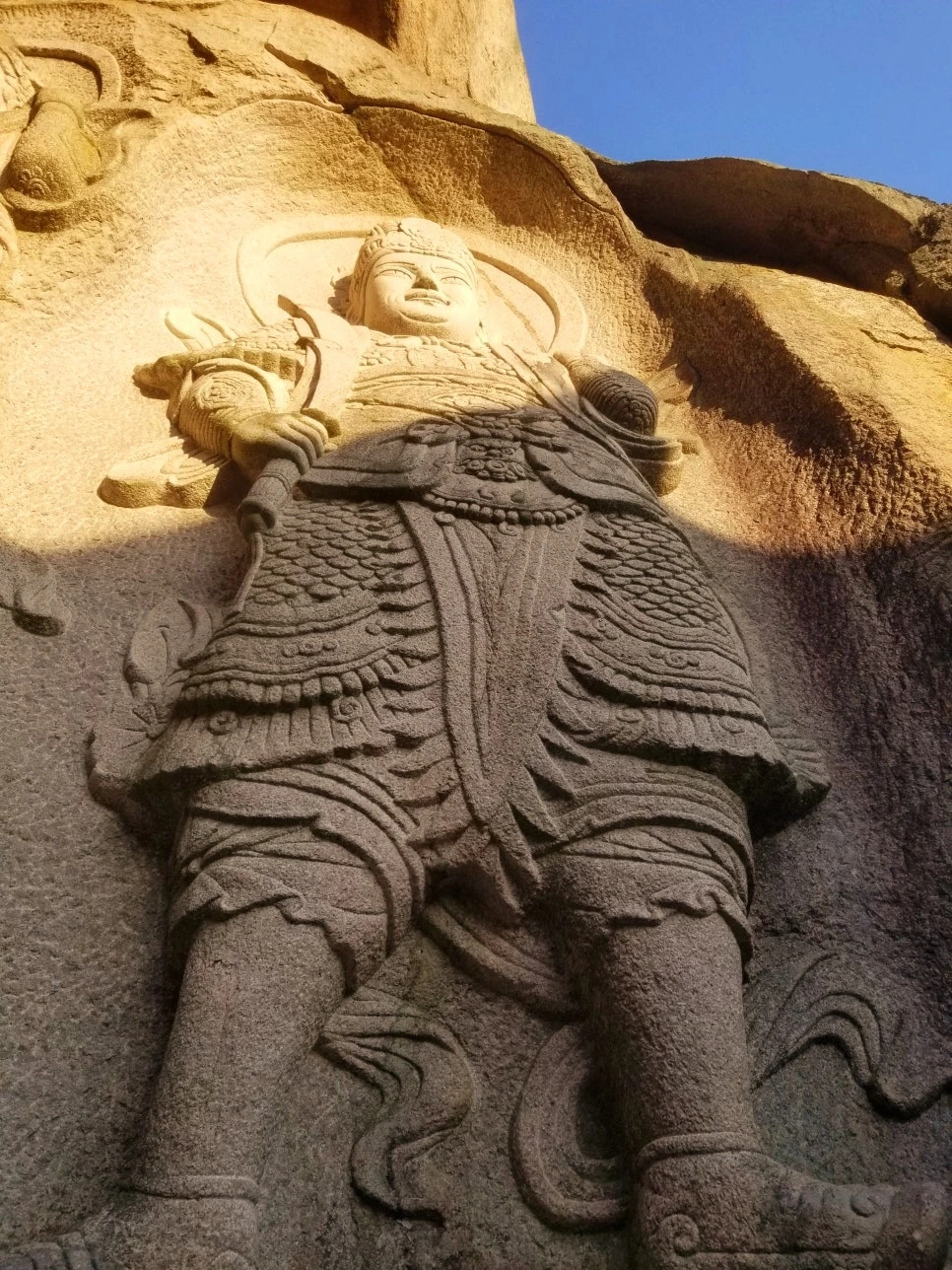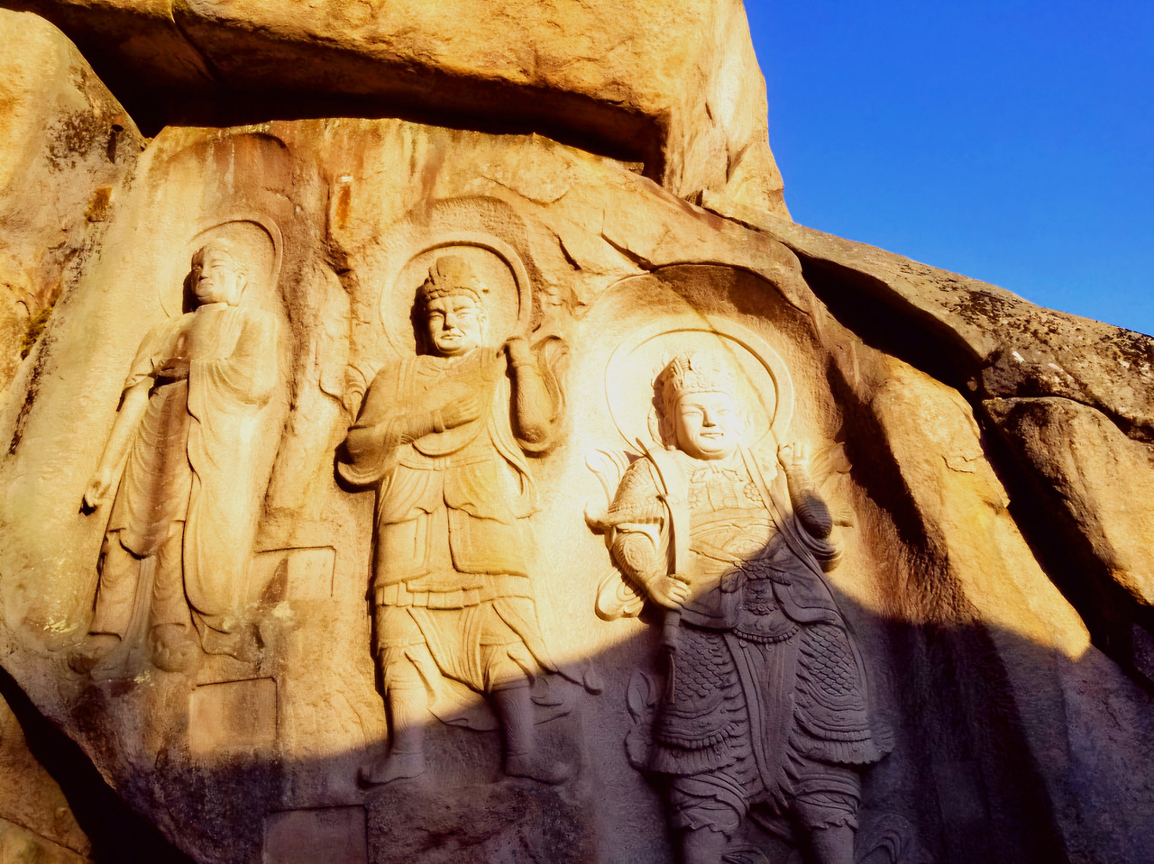 높이 40에서 20m가량 되는 직벽의 암석에 거대 불상을 그것도 깊이 돋을새김 했는데 높낮이가 매우 뚜렷하고 정교하다.