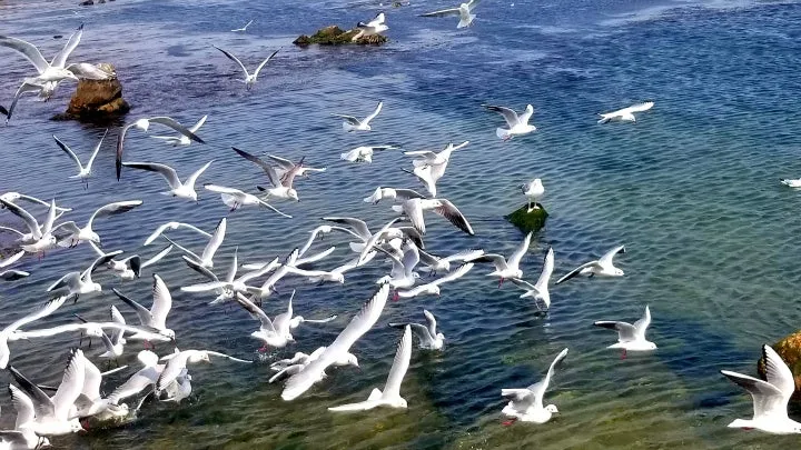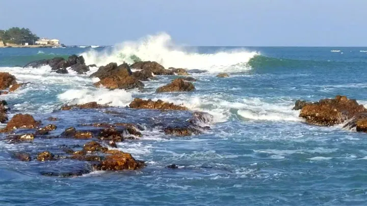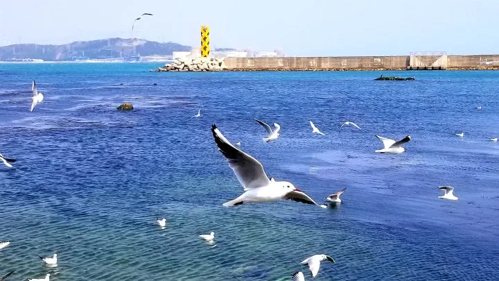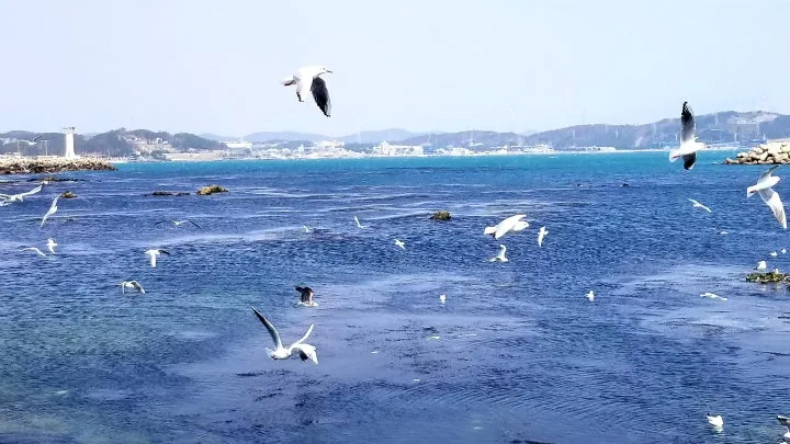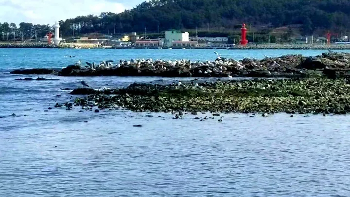 한무리 갈매기떼 서성대는 모래톱 지나 검푸른 바윗전에 쉼 없이 부딪는 파도의 위용.