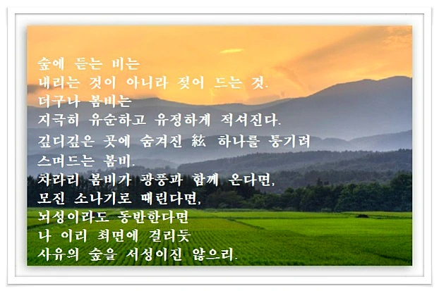 숲에 듣는 비는 내리는 것이 아니라 젖어드는 것. 더구나 봄비는 지극히 유순하고 유정하게 적셔진다. 깊디깊은 곳에 숨겨진 絃 하나를 퉁기려 스며드는 봄비. 차라리 봄비가 광풍과 함께 온다면, 모진 소나기로 때린다면, 뇌성이라도 동반한다면 나 이리 최면에 걸리듯 사유의 숲을 서성이진 않으리.