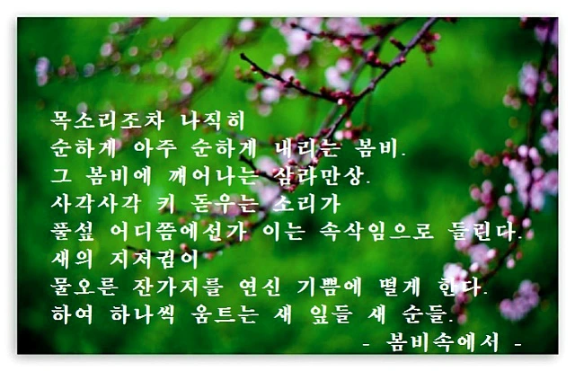 목소리조차 나직이 순하게 아주 순하게 내리는 봄비. 그 봄비에 깨어나는 삼라만상. 사각사각 키 돋우는 소리가 풀섶 어디쯤에선가 이는 속삭임으로 들린다. 새의 지저귐이 물오른 잔가지를 연신 기쁨에 떨게 한다. 하여 하나씩 움트는 새 잎들 새 순들. 겨우내 수척해진 청설모가 잽싸게 나무 사이로 건너뛴다. 약동을 준비하듯. 그 술렁임에 후드득 듣는 물방울. 본디 자리로 내려가 누운 낙엽들에 쉼 없이 적셔지는 봄비. 그 잎이 곱게 결삭아 다시 수액으로 오를 날도 멀지 않으리.