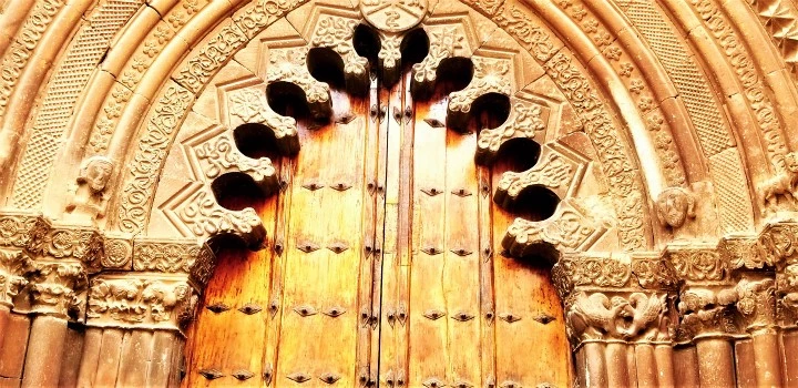 12세기 후반의 로마네스크식 성당 정문의 아치는 석조가 아닌 목조각같이 정교한 솜씨를 품고 있다.