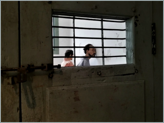 <벽을 통해 서로 수신호를 주고받는 뼈 앙상한 모습의 독립투사>