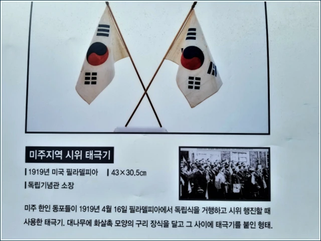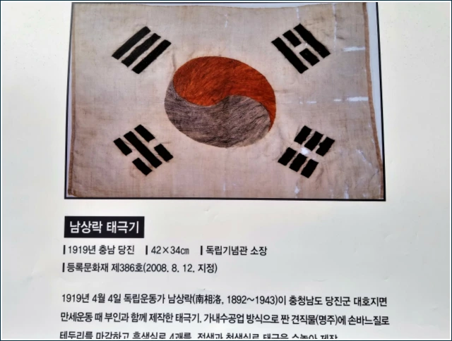 <고향인 충남 당진군 대호지에서 만세운동을 주도한 외조부 항렬인 相 자 어른께서 손수 짠 명주 천에 수를 놓아 만든 태극기>